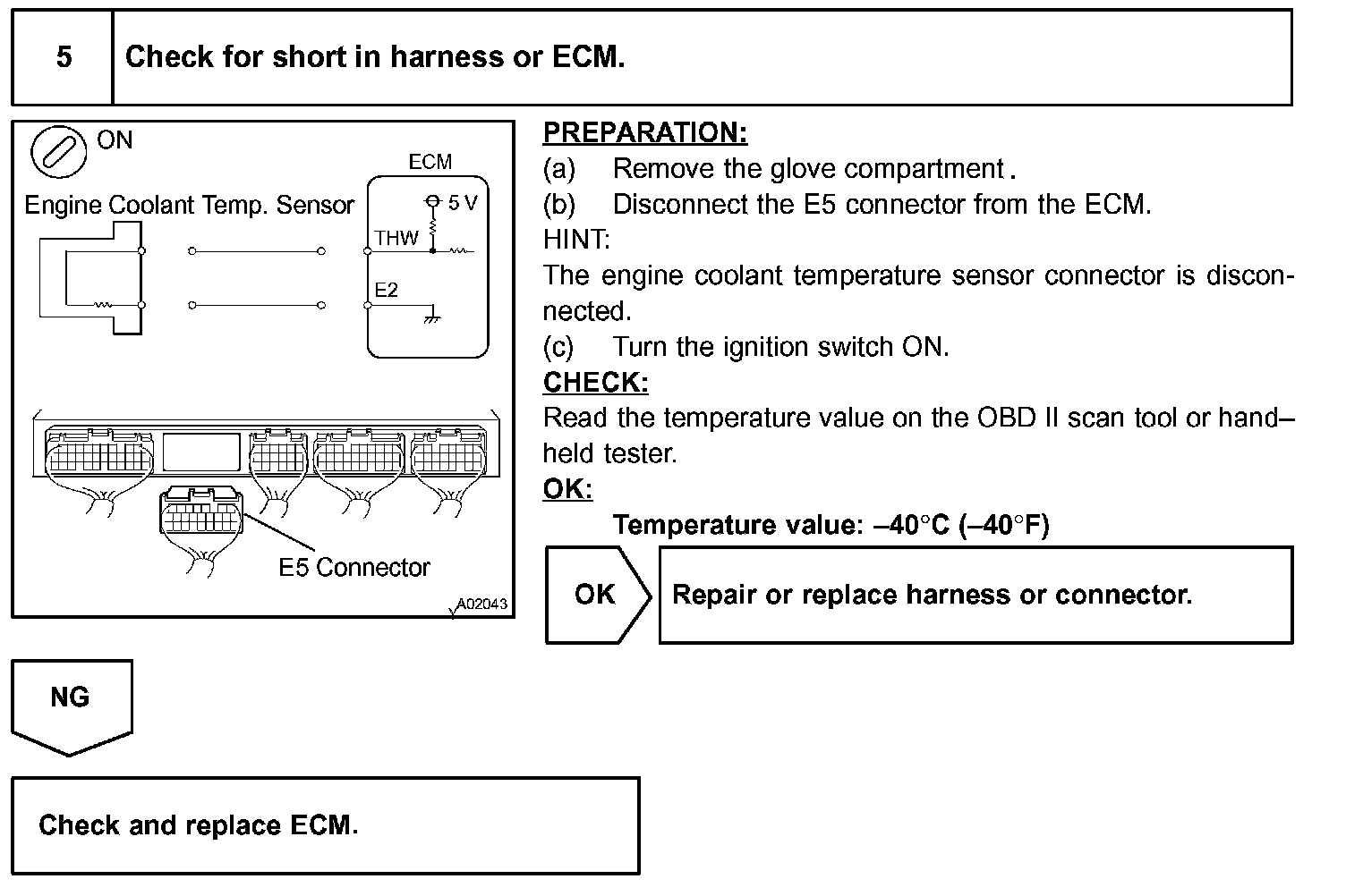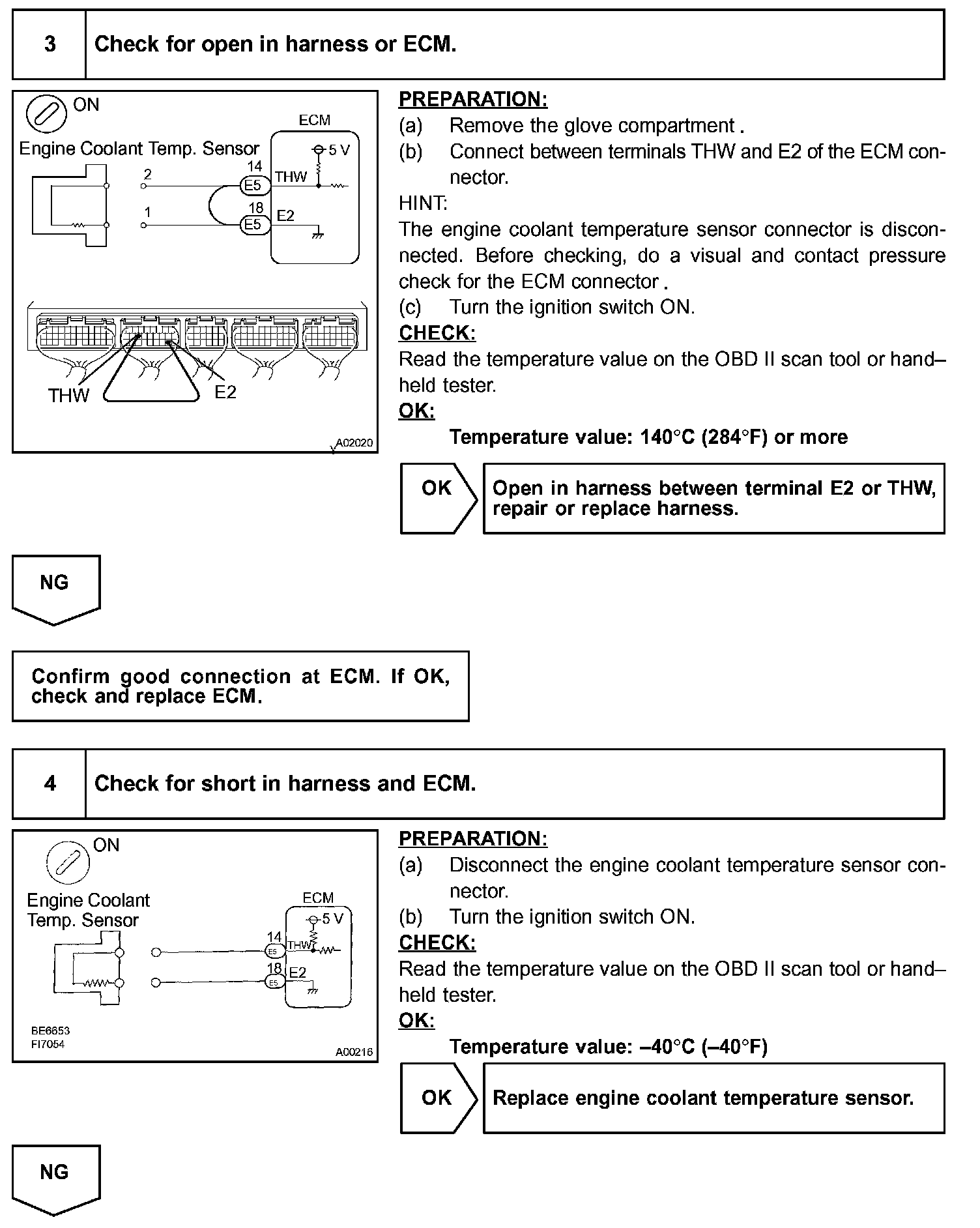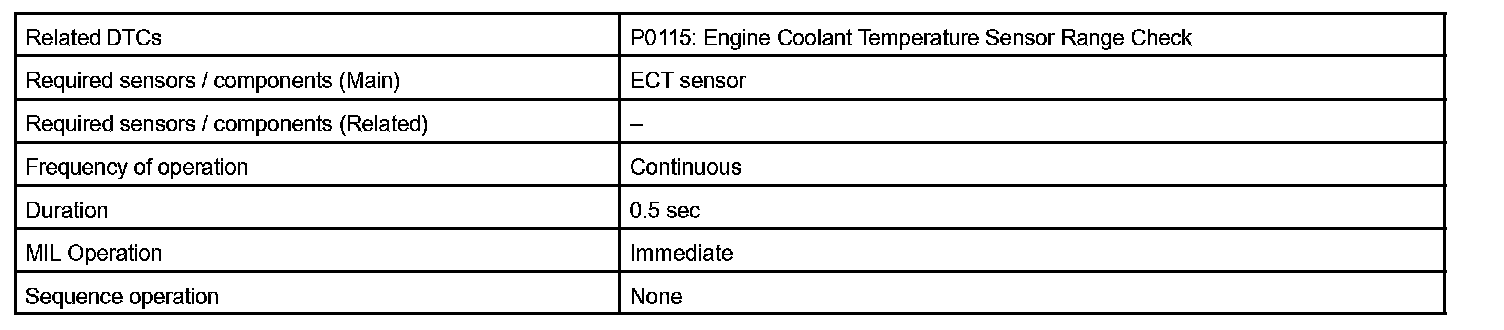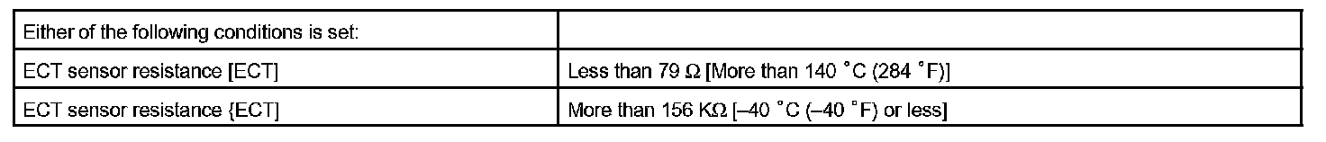 When the ECM calculates that the ECT is -40 °C (-40 °F) or more than 140 °C (284 °F) and if either condition continues 0.5 seconds or more, the ECM will set a DTC.
