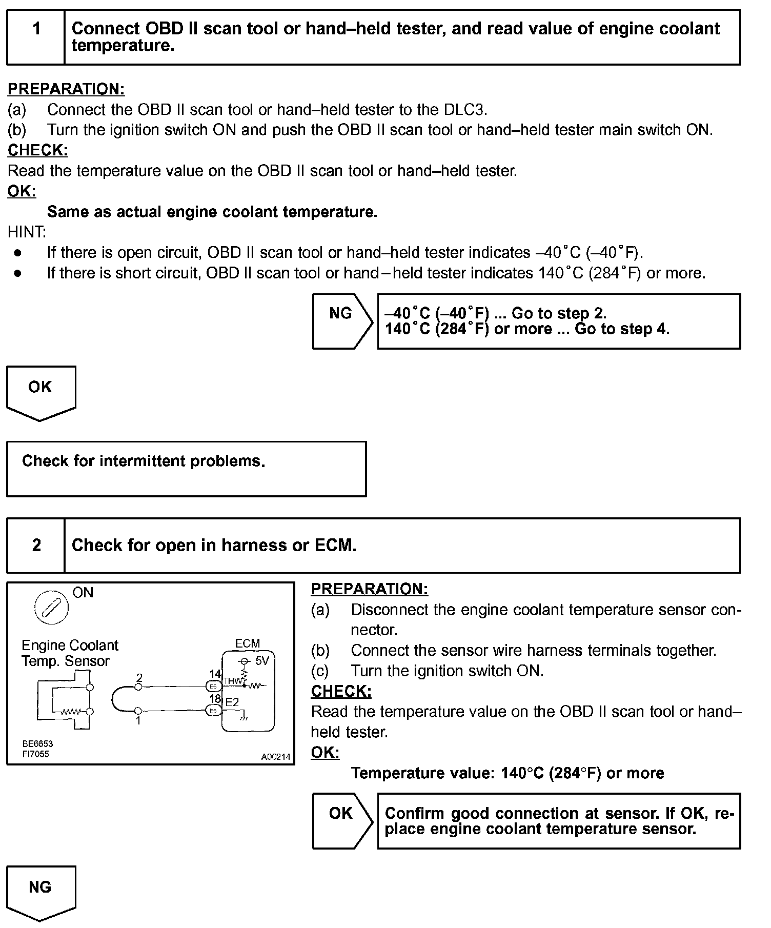 HINT: After confirming DTC P0115, use the OBD II scan tool or hand-held tester to confirm the engine coolant temperature from the CURRENT DATA.