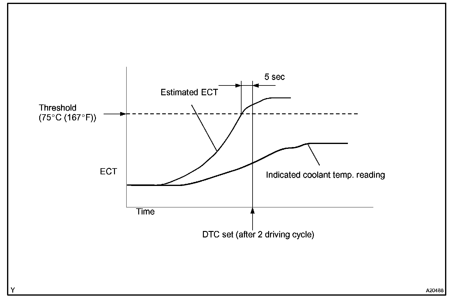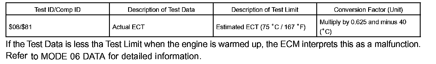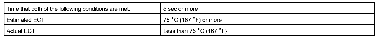 The ECM estimates the coolant temperature based on starting temperature, engine loads, and engine speeds. The ECM then compares the estimated temperature with the actual ECT. When the estimated coolant temperature reaches 75 °C (167 °F), the ECM checks the actual ECT. If the actual ECT is less than 75 °C (167 °F), the ECM will interpret this as a fault in the thermostat or engine cooling system or thermostat and set a DTC.