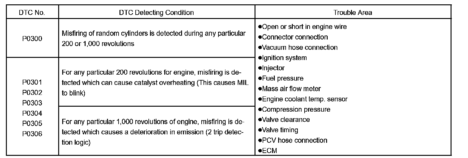HINT: When the 2 or more codes for a misfiring cylinder are recorded repeatedly but no Random Misfire code is recorded, it indicates that the misfires were detected and recorded at different times.