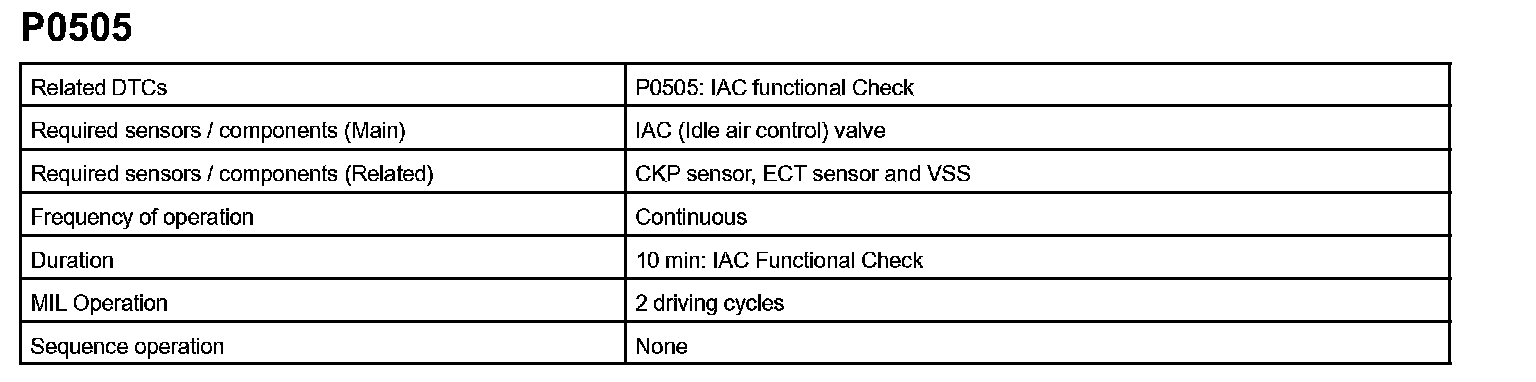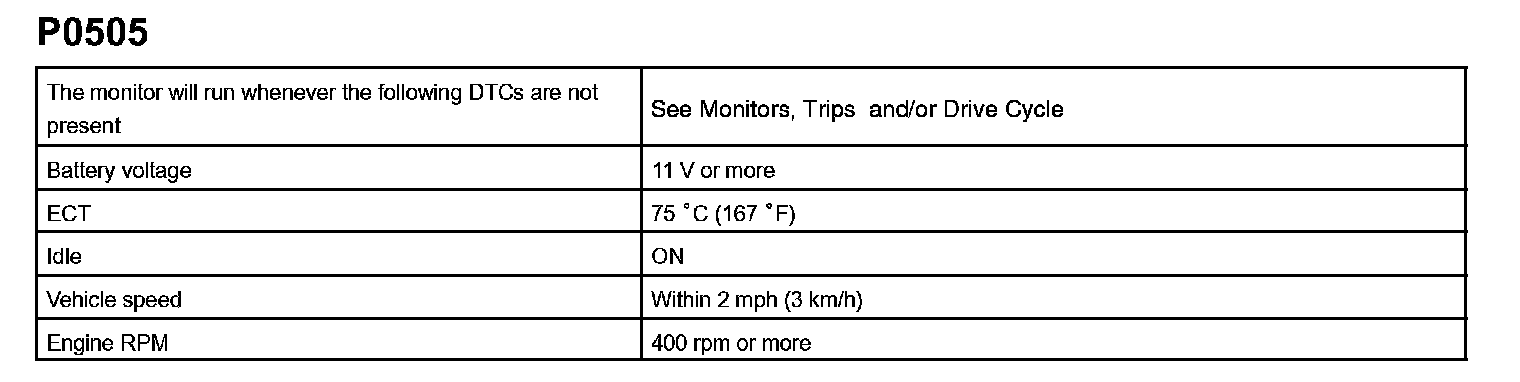 If the RPM difference between the targeted and actual idle engine RPMs exceeds 200 rpm (*1) with the vehicle stopped in an idle, and this occurs 5 times, or if the learned value angle of the IAC remains at its maximum or minimum angle for 5 seconds, P0505 is detected.