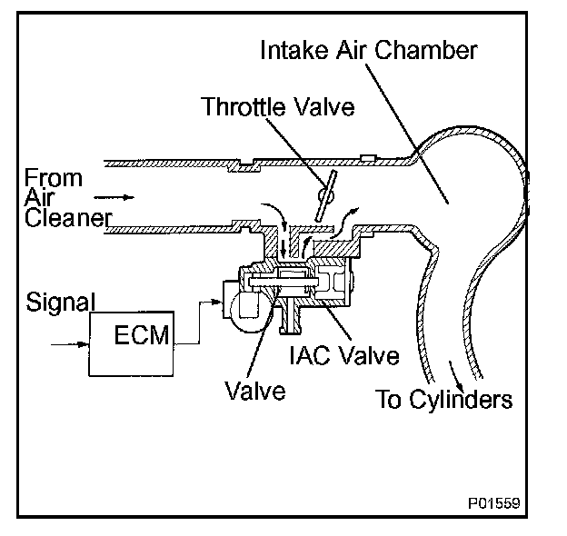 The rotary solenoid type IAC valve is located in front of the intake air chamber and intake air bypassing the throttle valve is directed to the IAC valve through a passage.