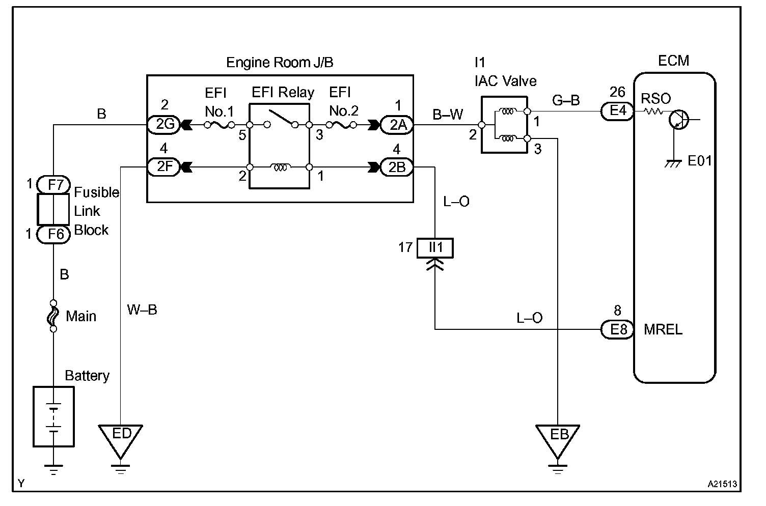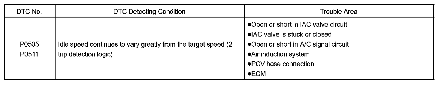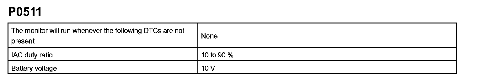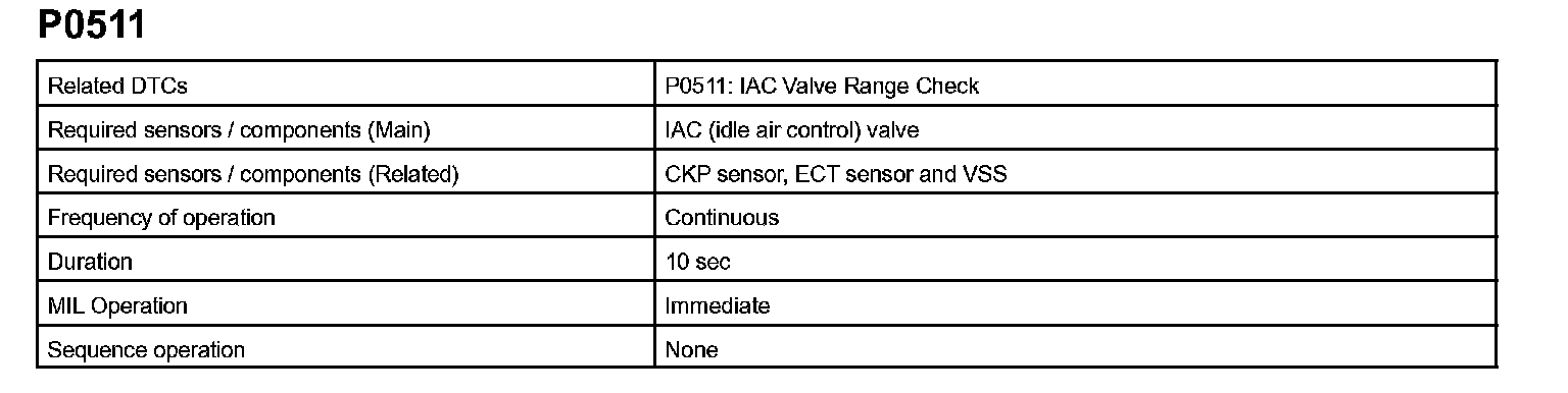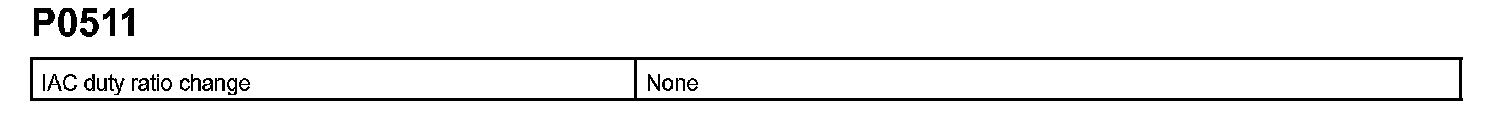 P0511 is detected as an open/short circuit in the IAC if the rate of duty signal input to the IAC valve has stuck at 0 % or 100 %.