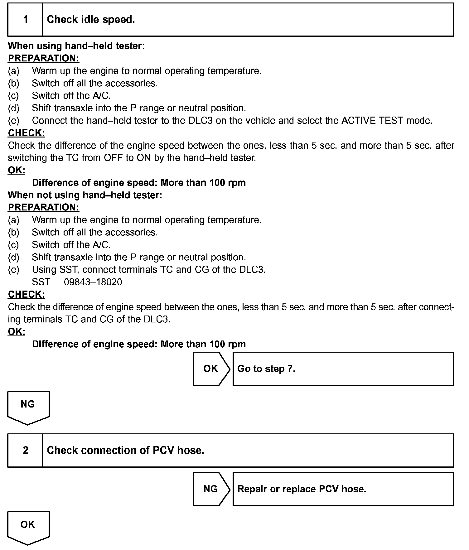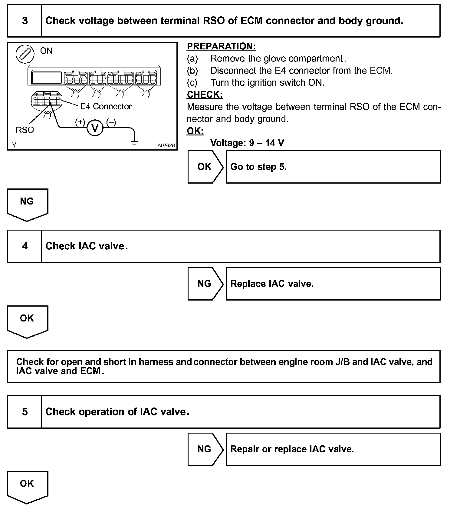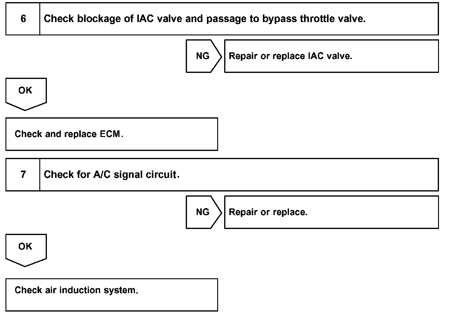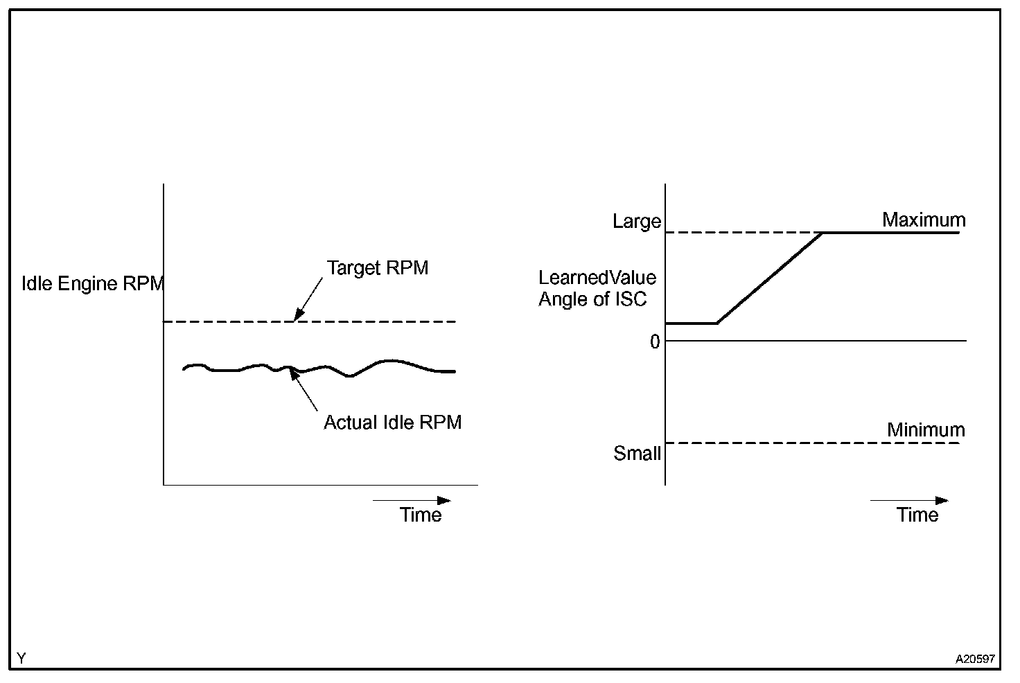 Although the ECM regulates the idle engine RPM with the feedback control in several vehicle stopped, actual idle RPM dose not reach the targeted RPM and a learned valve of the idle air control (IAC) remains at the maximum or remains at the minimum, the ECM determines to detect malfunction in the IAC system.