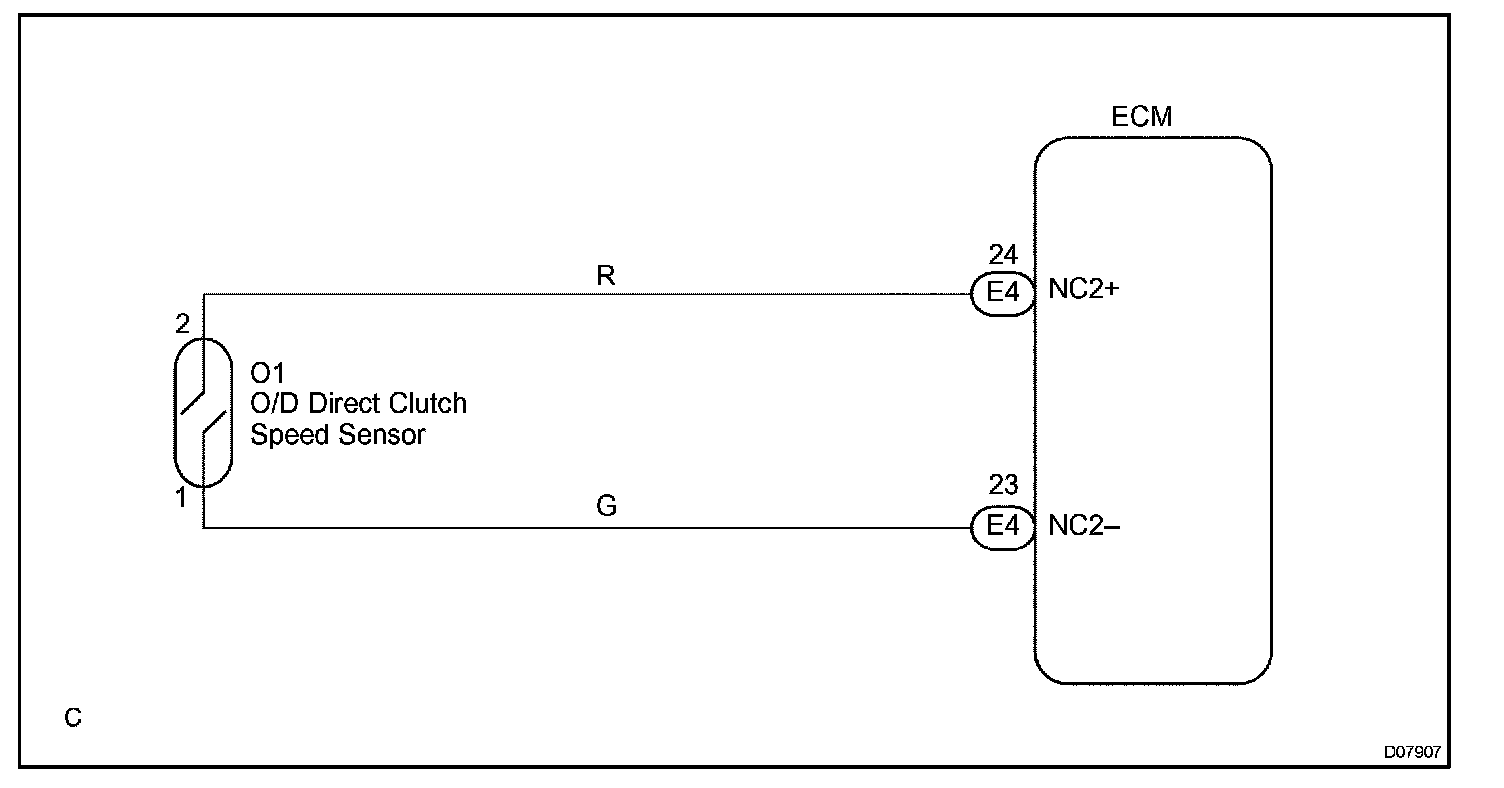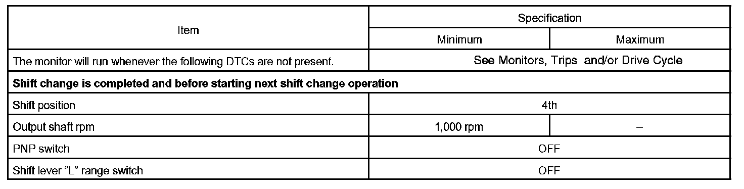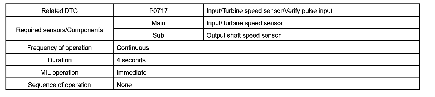 When the output shaft speed is higher than the expected value and the input shaft speed is less than 300 rpm while running with the shift lever in the D position, the ECM will conclude that the input turbine speed sensor (NT) has a malfunction. The ECM will illuminate the MIL and set a DTC.