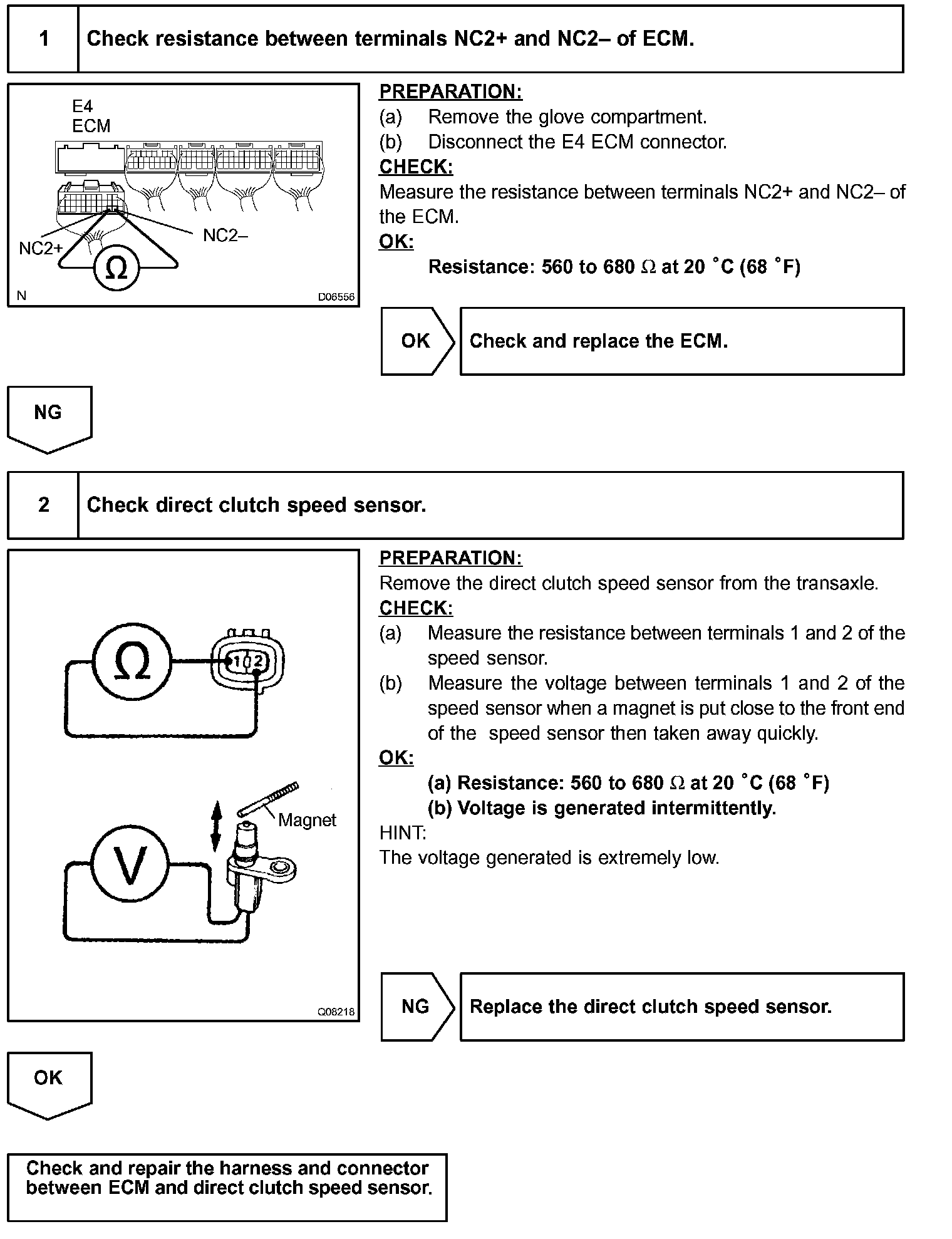 This sensor detects the rotation speed of the direct clutch drum. By comparing the direct clutch speed signal with the vehicle speed sensor signal, the ECM detects the shift timing of the gears and appropriately controls the engine torque and hydraulic pressure in response to various conditions, thus performing smooth gear shifting.