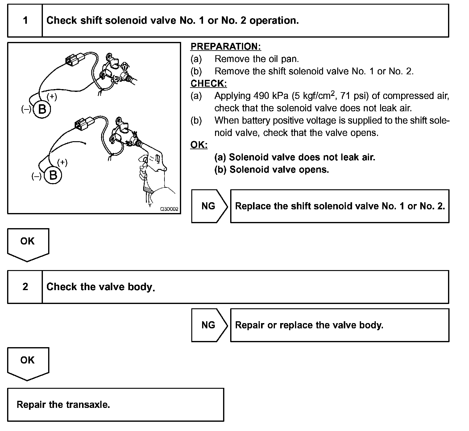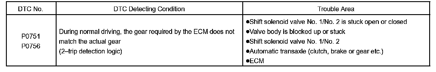 HINT: Check the shift solenoid valve S1 when DTC P0751 is output and check the shift solenoid valve S2 when DTC P0756 is output.