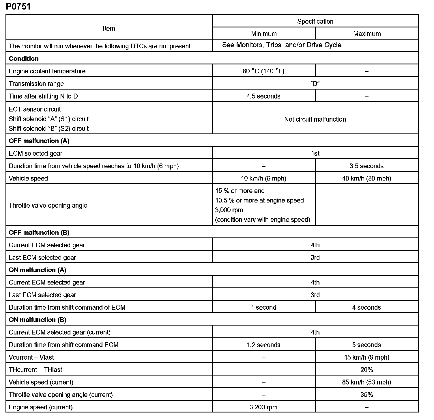 The ECM commands transmission gearshifts by turning the shift-solenoid valves ON and OFF. Using the signals from the input speed sensor (input shaft speed), the counter shaft speed sensor (counter shaft speed) and the output speed sensor (output shaft speed), the ECM calculates the actual gear position [1st, 2nd, 3rd, 4th) gear position]. When the gear position required by the ECM and the actual gear position are not same, the ECM illuminates the MIL and a DTC is set.