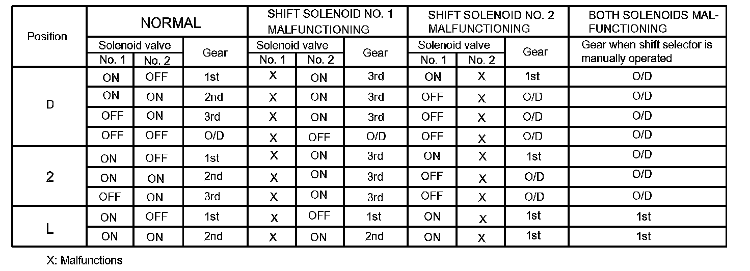 If either of the shift solenoid valve circuits develops an open or short, the ECM turns the other shift solenoid ON and OFF to shift the gear positions as shown in the table below. The ECM also turns the shift solenoid valve SL OFF at the same time. If both solenoids are malfunctioning, hydraulic control cannot be performed electronically and must be done manually.