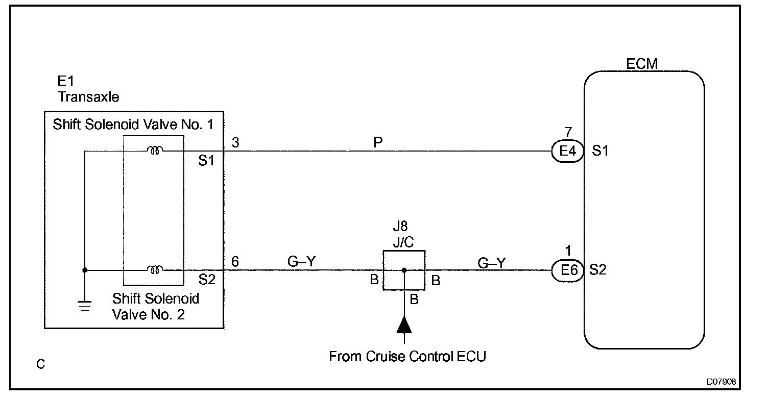 The ECM commands transmission gearshifts by turning the shift-solenoid valves ON and OFF. If the ECM detects an open or short circuit in any shift-solenoid valve, it will illuminate the MIL and set a DTC. At this time, the ECM will enter the "fail-safe" mode. The ECM will stop sending command signal(s) to the malfunctioning solenoid but will continue to operate the other solenoid valves to provide partial transmission operation.