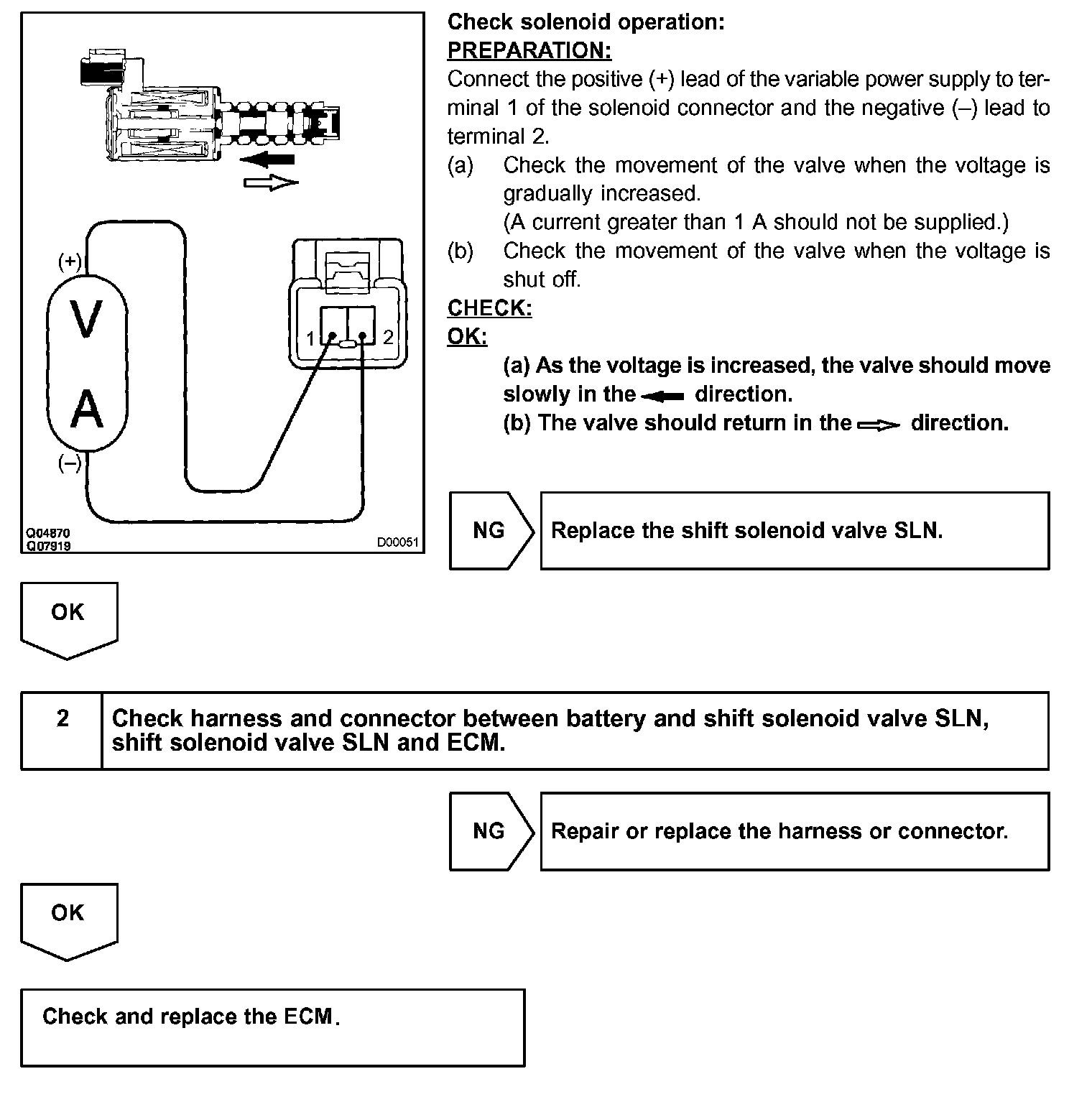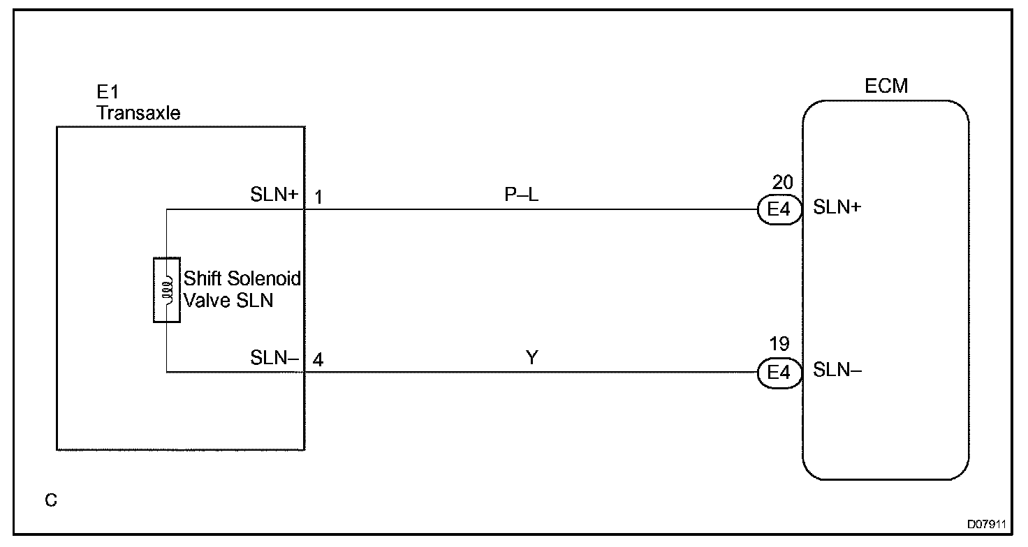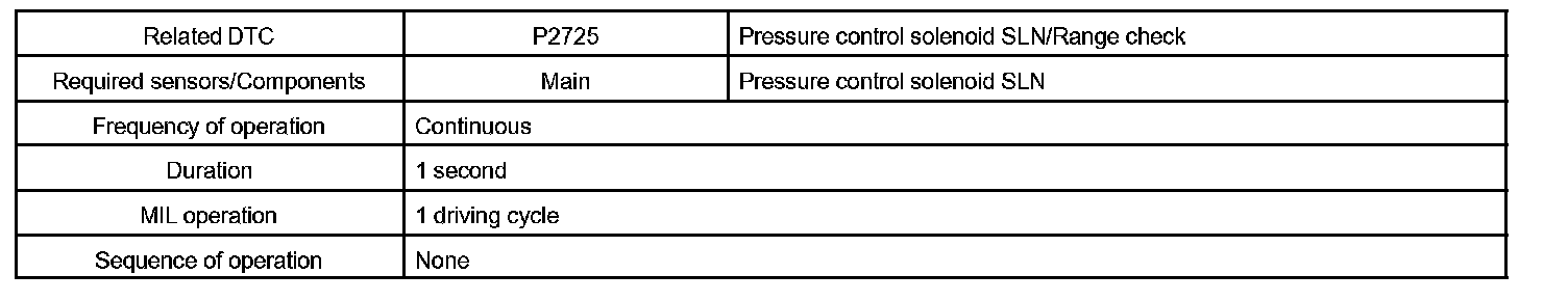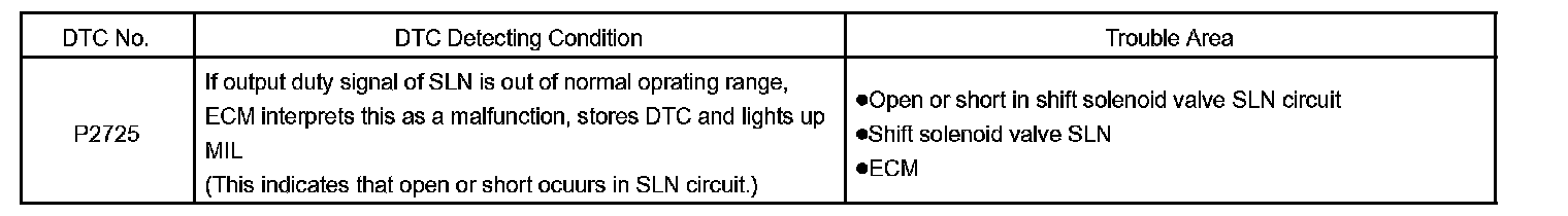 The ECM illuminates the MIL and sets a DTC when it detects an open or a short circuit malfunction in the shift solenoid valve SLN.