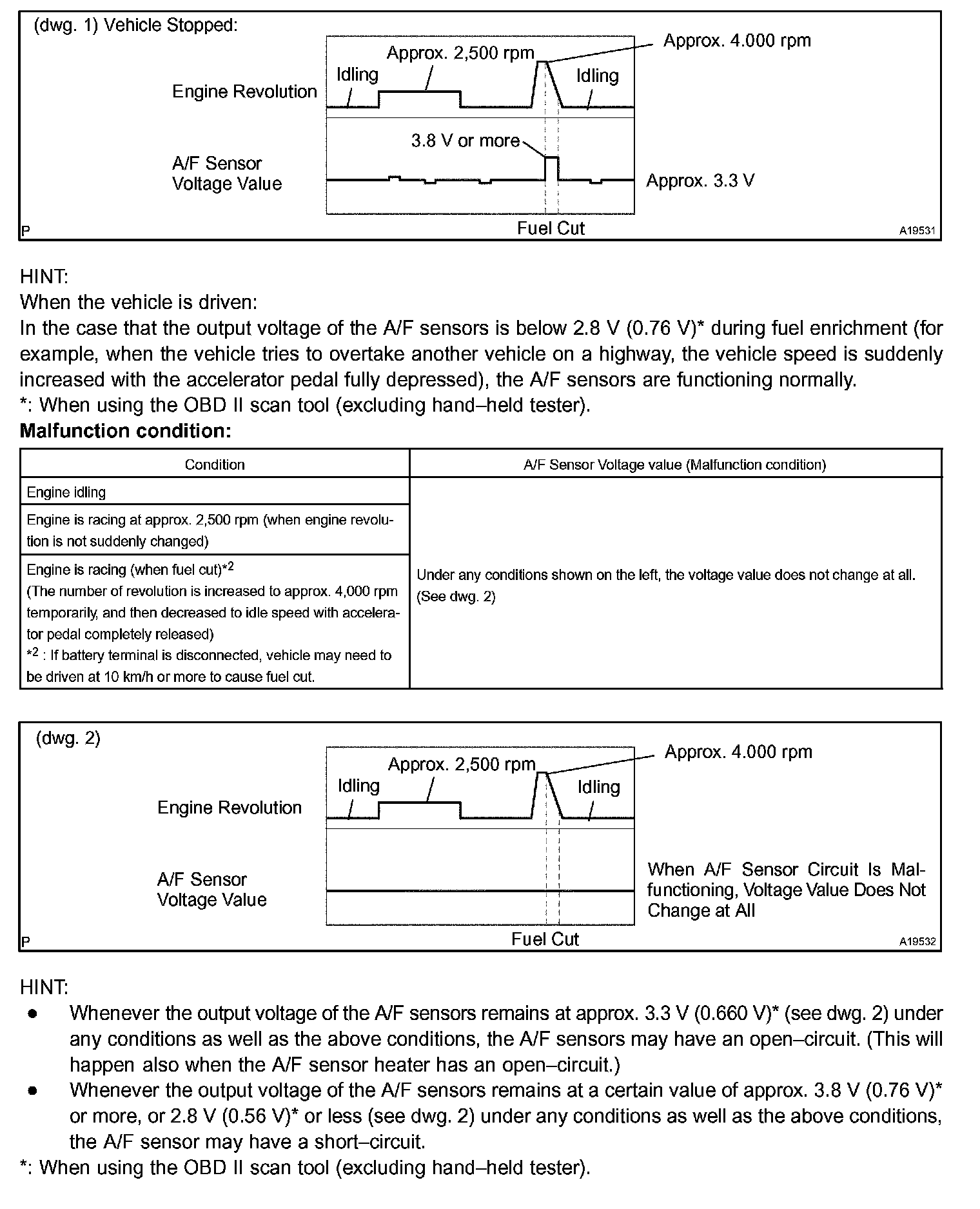 To obtain a high purification rate for the CO, HC and NOx components of the exhaust gas, a three-way catalytic converter is used, but for the most efficient use of the three-way catalytic converter, the air-fuel ratio must be precisely controlled so that it is always close to the stoichiometric air-fuel ratio. The A/F sensor has the characteristic that provides output voltage* approximately proportional to the existing air-fuel ratio. The A/F sensor output voltage* is used to provide feedback for the ECM to control the air-fuel ratio.