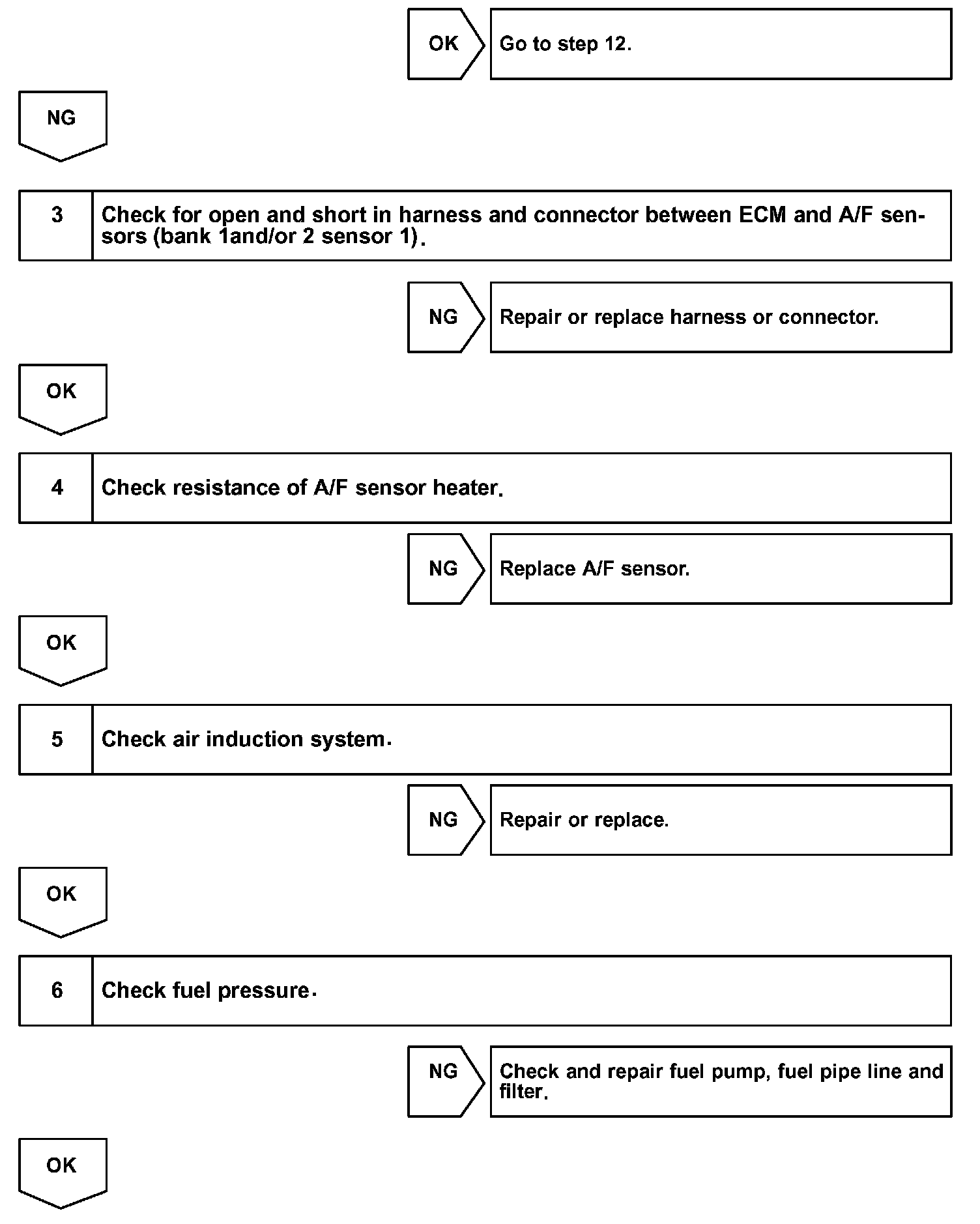 The air-fuel ratio (A/F) sensor varies its output voltage in proportion to the air-fuel ratio. Based on the output voltage, the ECM determines if the air-fuel ratio is RICH or LEAN and adjusts the stoichiometric air-fuel ratio. The ECM also checks the fuel injection volume compensation value to check if the A/F sensor is deteriorating or not. A/F sensor response deterioration is determined by the A/F sensor output voltage variation and fuel trim variation.