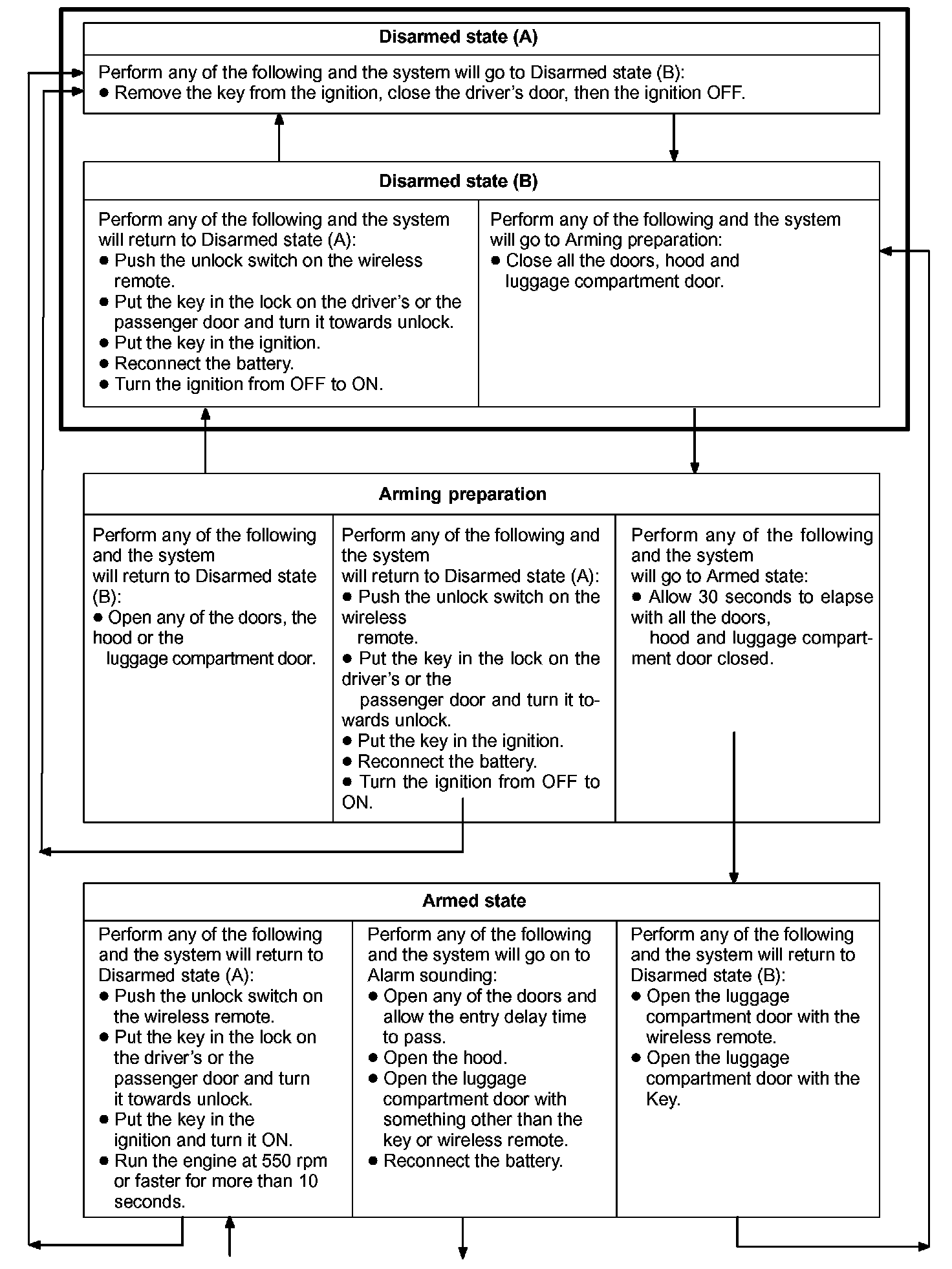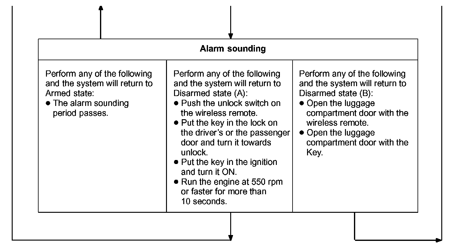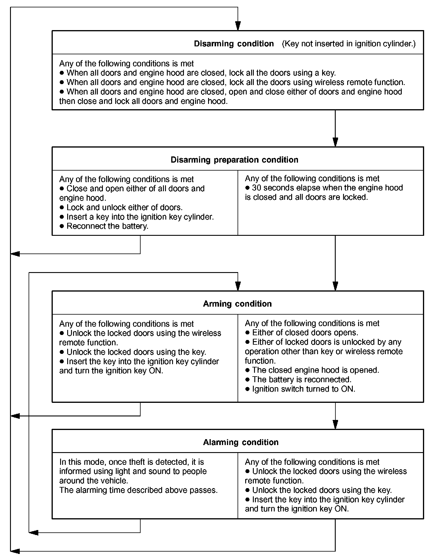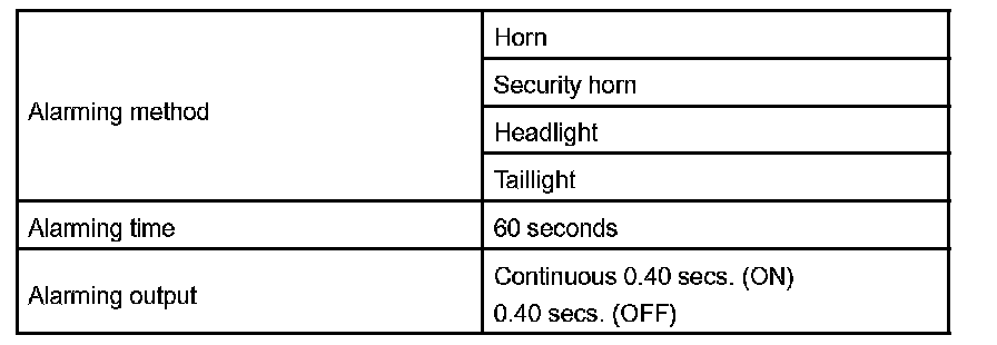 Is this condition, once theft is detected, it is informed using light and sound to people around the vehicle. Refer to the table for alarming method or time.