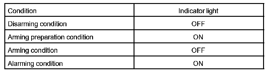 HINT: Even in disarming condition, the indicator light flash. (Due to the signal output form immobilizer system). The indicator always flashes receiving the signal from the immobilizer system at any time in the arming condition.