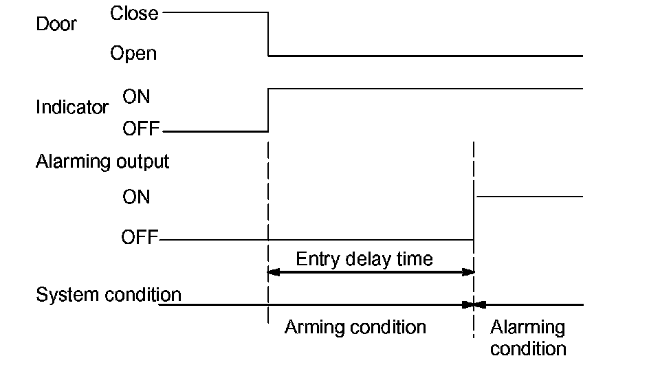 In arming condition either closed door is opened, entry delay occurs. (14 secs.)