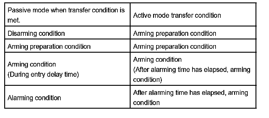 In each passive mode, when "disarming condition of active mode -> arming preparation transfer condition" is met, the active mode transfers to each condition. In this case, active mode continues till disarming condition.