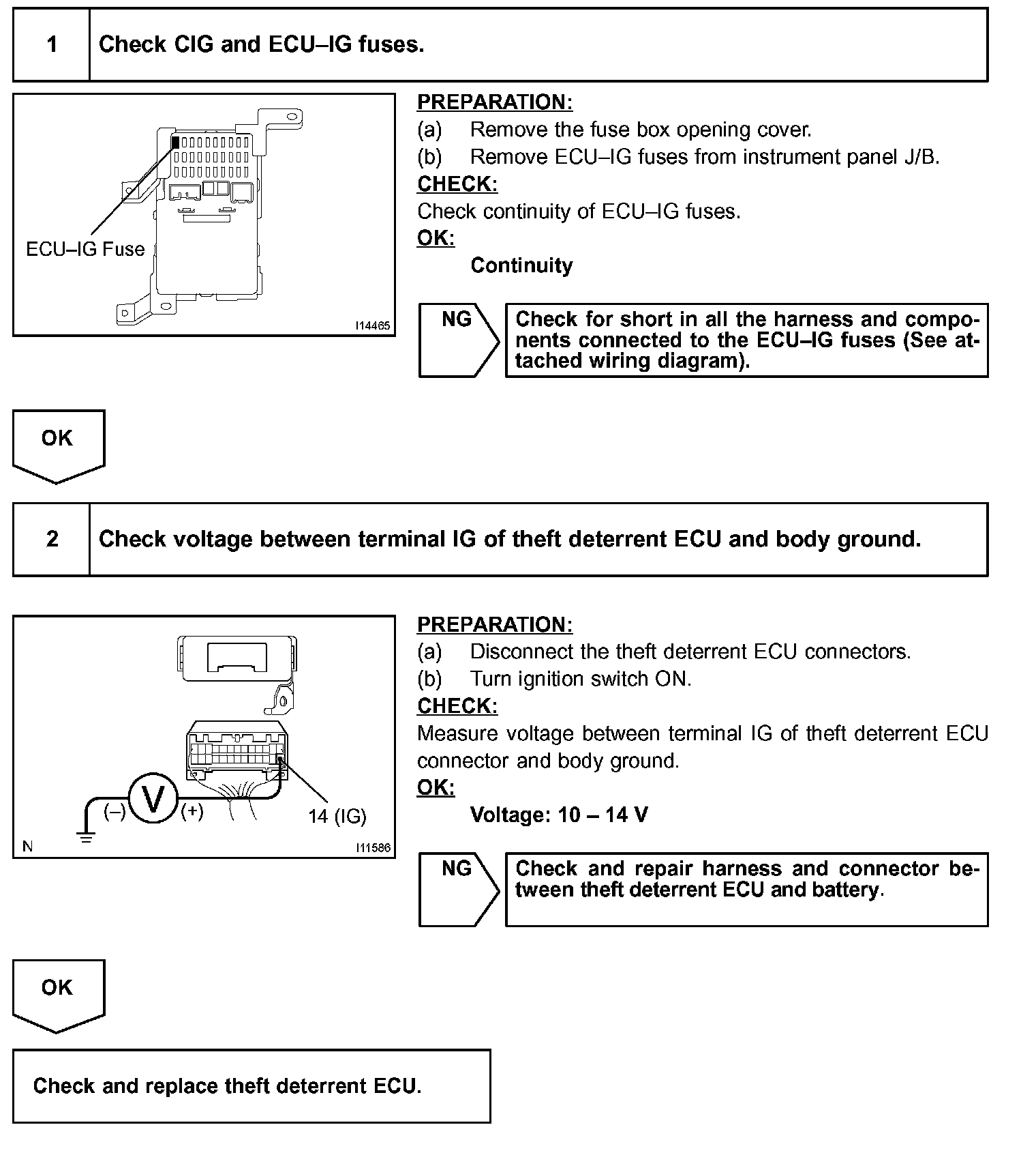 CIRCUIT DESCRIPTIONWhen the ignition switch is turned to the ACC position, battery positive voltage is applied to the terminal ACC of the ECU. Also, if the ignition switch is turned to the ON position, battery positive voltage is applied to the terminals ACC and IG of the ECU. When the battery positive voltage is applied to the terminal ACC of the ECU while the theft deterrent system is activated, the warning stops. Furthermore, power supplied from the terminals ACC and IG of the ECU is used as power for the door courtesy switch, and position switch, etc.