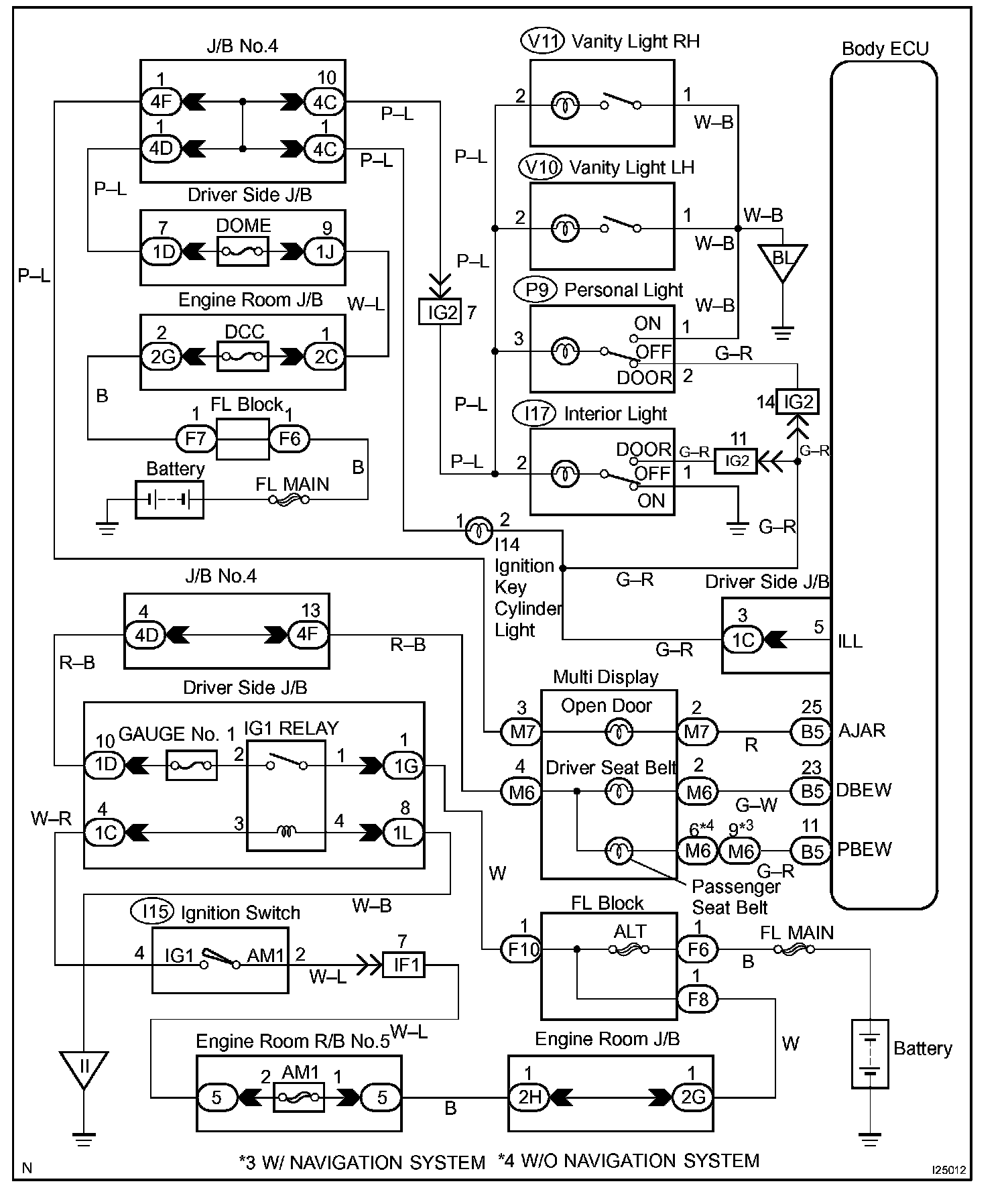 Receiving the courtesy signal from either of the door ECU, the Body ECU will make the interior light, ignition light, and foot light come on.