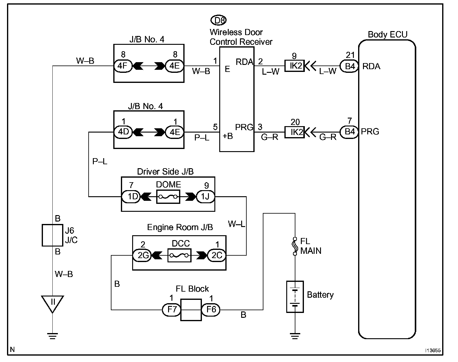 CIRCUIT DESCRIPTIONThe signal from the transmitter will be input to the body ECU through RDA line. RDA line is diagnosed by the Body ECU, so check DTC also in case of the failure of the wireless function.