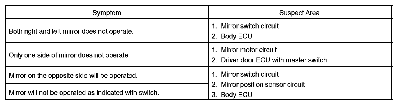 Problem Symptom Table - Power Mirror Control System: