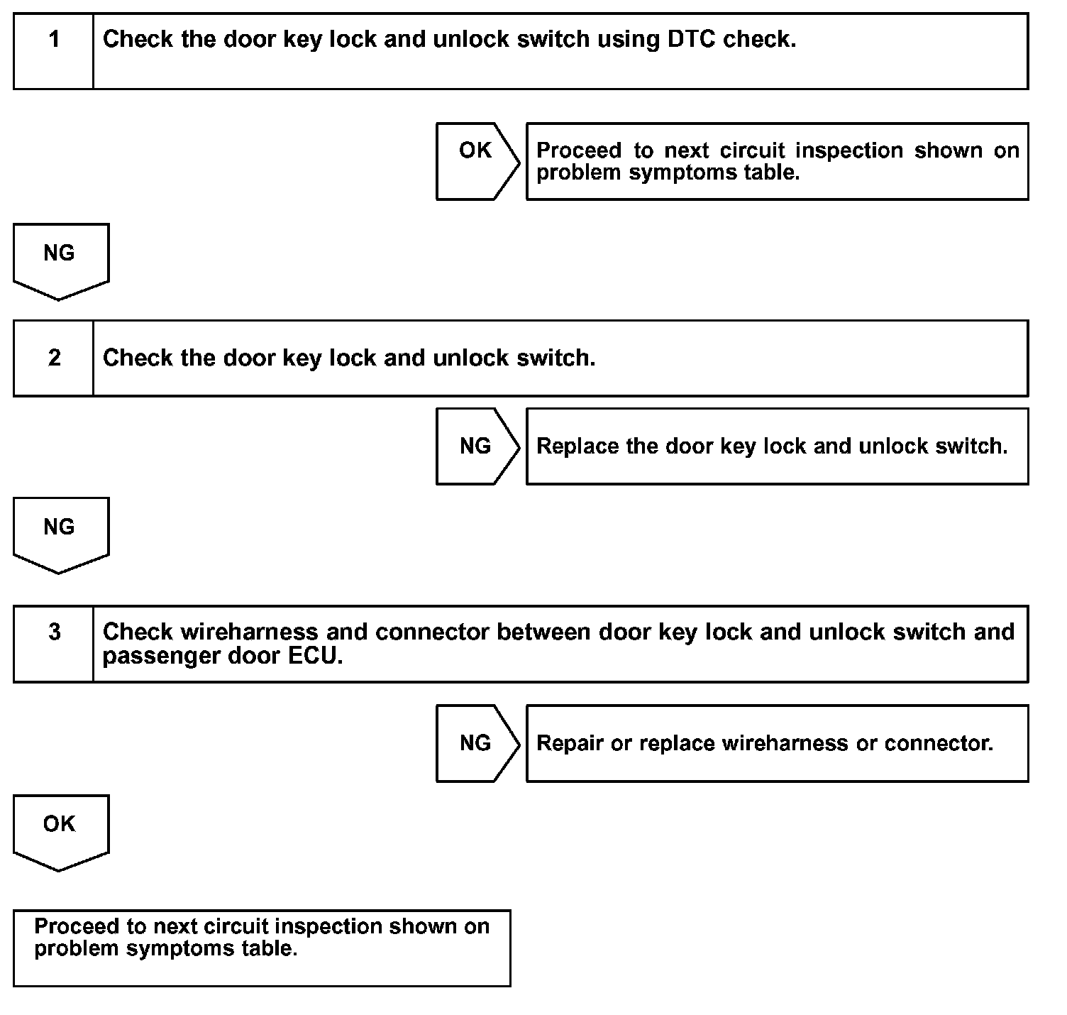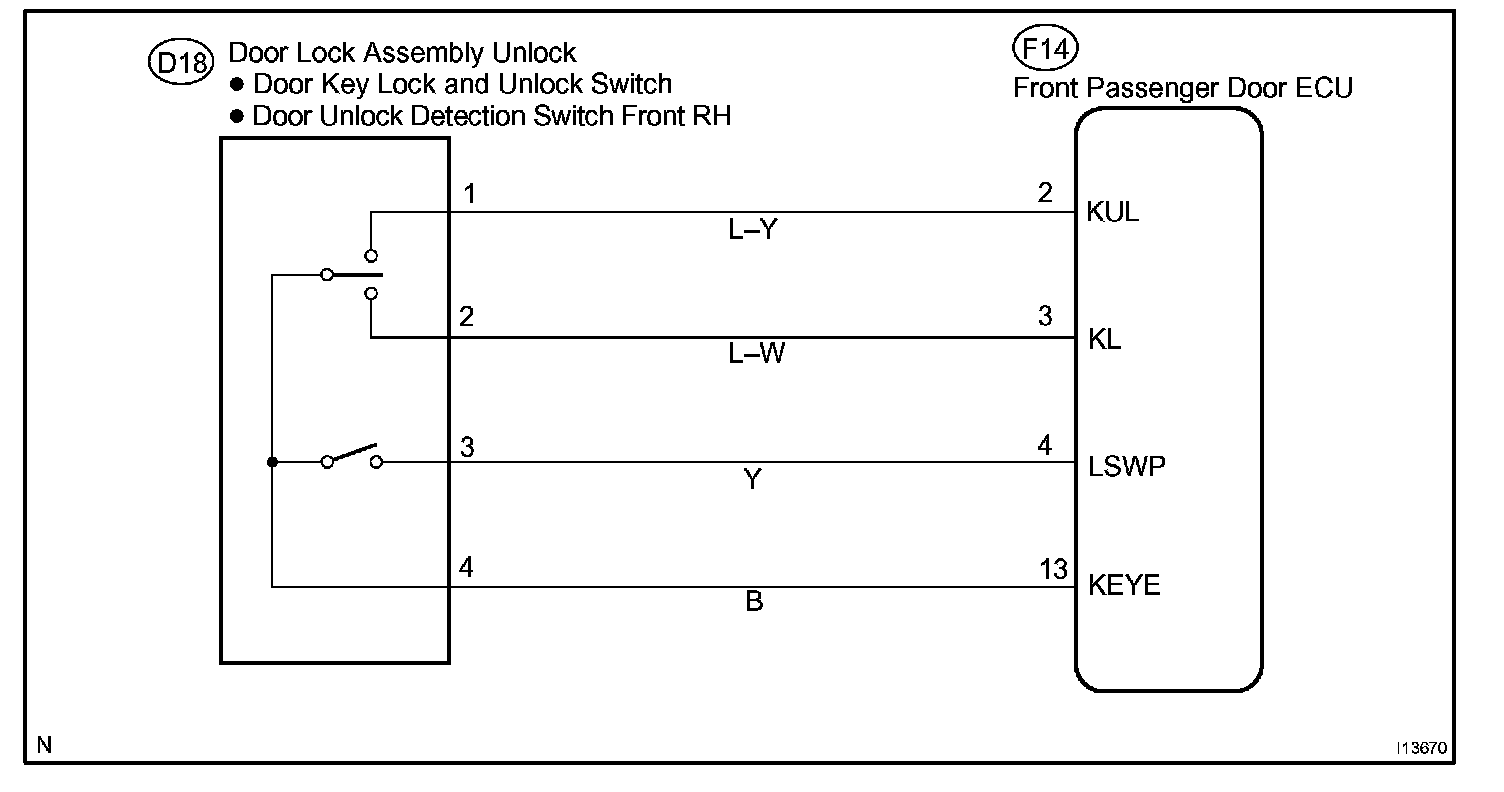 The door key lock and unlock switch is built in the door key cylinder. When the key is turned to the lock side, terminal 3 of the switch is grounded and when the key is turned to the unlock side, terminal 2 of the switch is grounded.