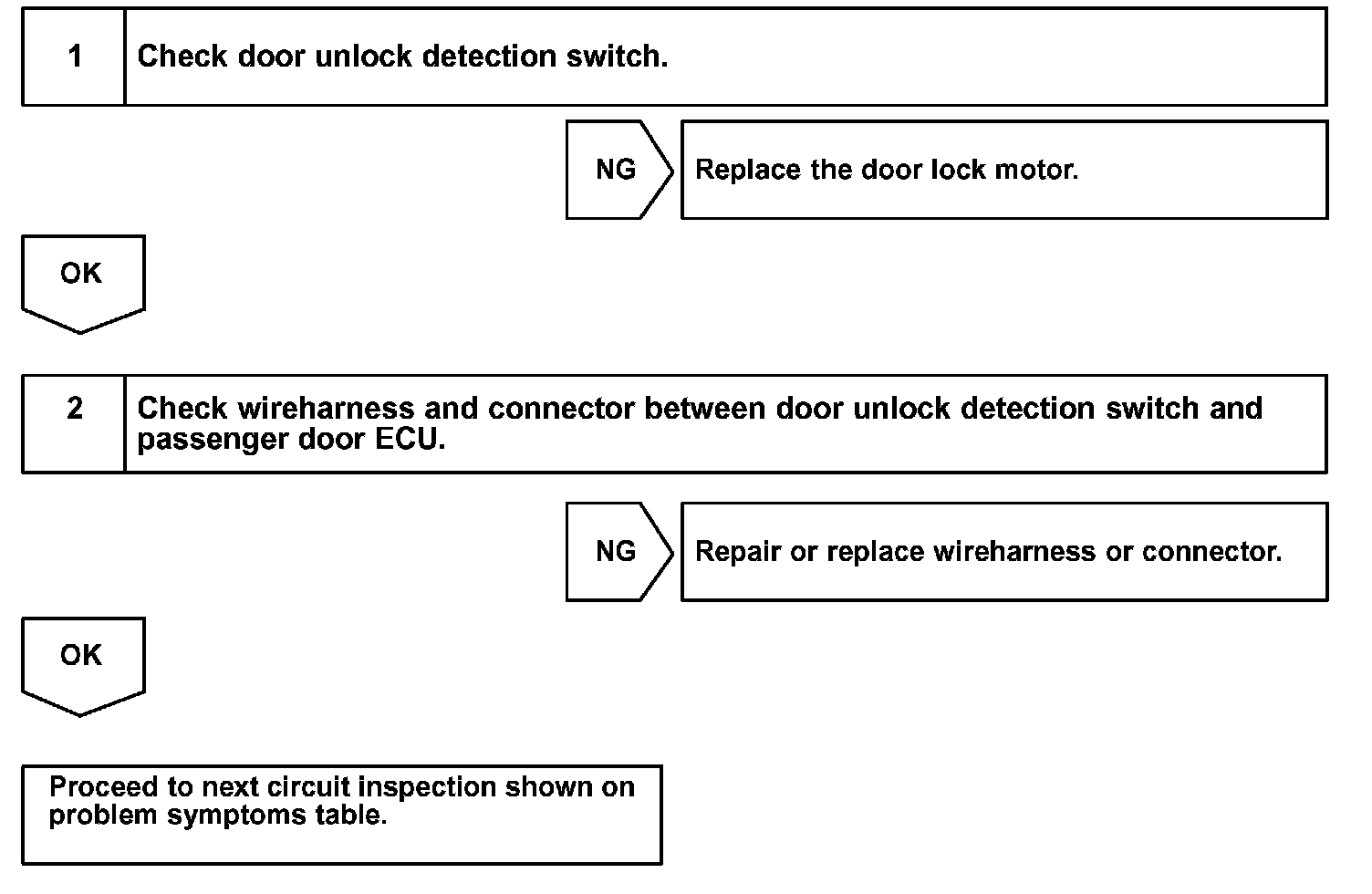 CIRCUIT DESCRIPTIONThe door unlock detection switch is built in the door lock motor assembly. This switch is ON when the door lock knob is in the unlock position and OFF when the lock knob is in the lock position. The ECU detects the door lock knob conditions is this circuit. It is used as one of the operating conditions for the key confinement prevention function.