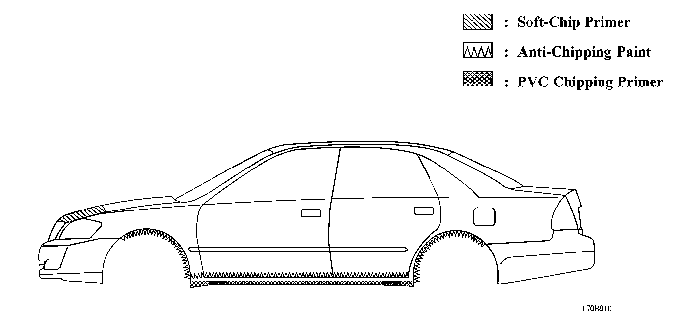 Anti-chipping paint and PVC chipping primer are applied to the lower door panel area, front and rear wheel arches and the rocker panel area to protect them from stone chipping. In addition, soft-chip primer is applied to the hood.