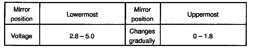 d. Apply Battery voltage to terminals 2 and 3, then check that the voltage gradually changes according to the table while the mirror moves between the uppermost position and lowermost position.