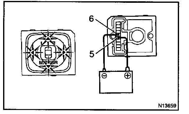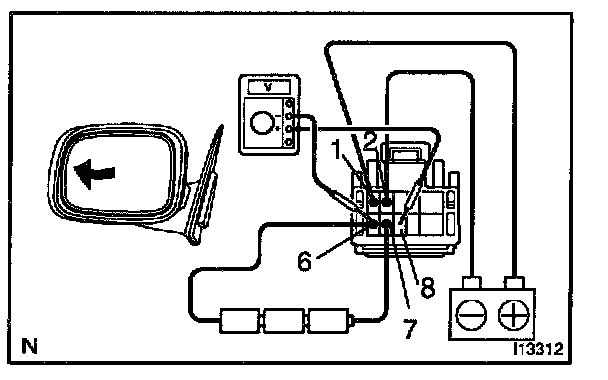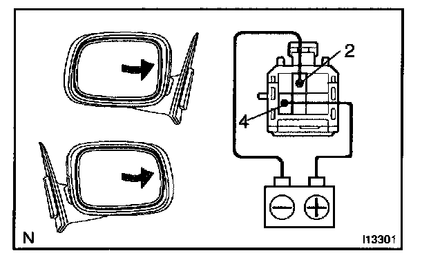 c. Connect the positive (+) lead from the battery to terminal 4 and the negative (-) lead to terminal 2, and check that the mirror turns upward.