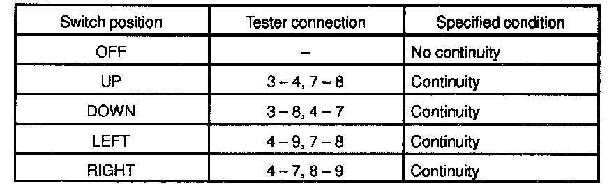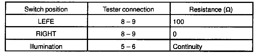 - Measure resistance between terminals 7 and 9 at each switch position, as shown in the chart.