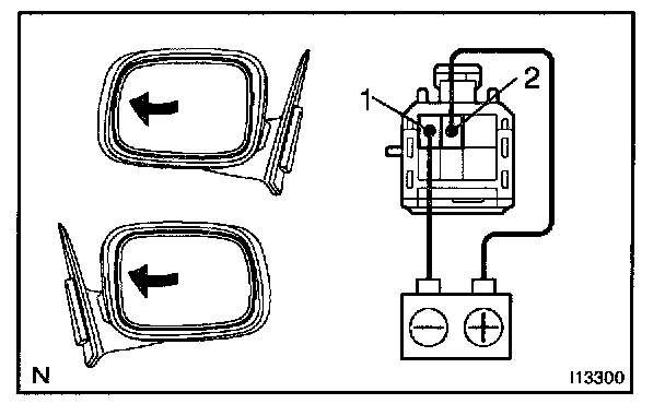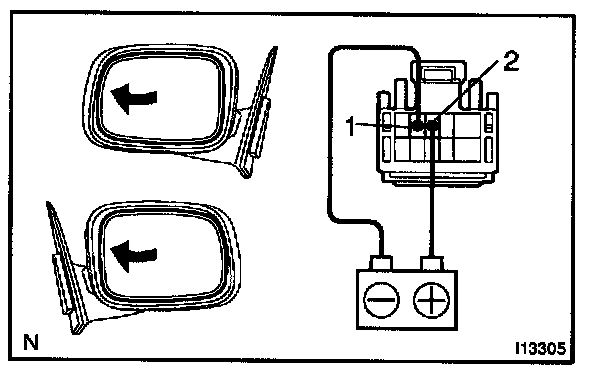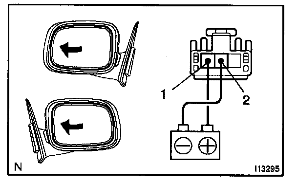 a. Connect the positive (+) lead from the battery to terminal 1 and the negative (-) lead to terminal 2, and check that the mirror turns to the left side.