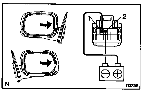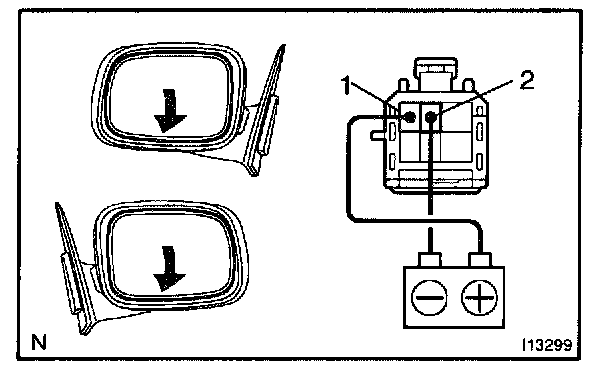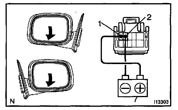 c. Connect the positive (+) lead from the battery to terminal 2 and the negative (-) lead to terminal 1, and check that the mirror turns upward.