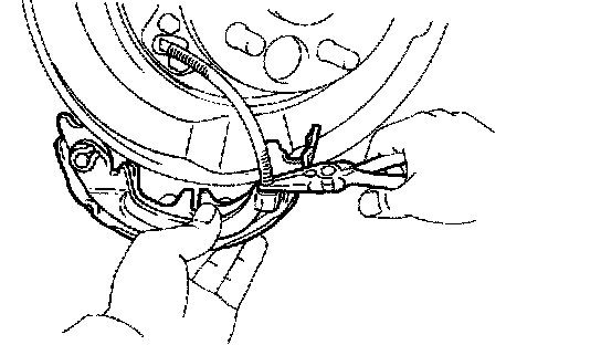c. Using needle-nose pliers, disconnect the parking brake cable from the parking brake shoe lever.