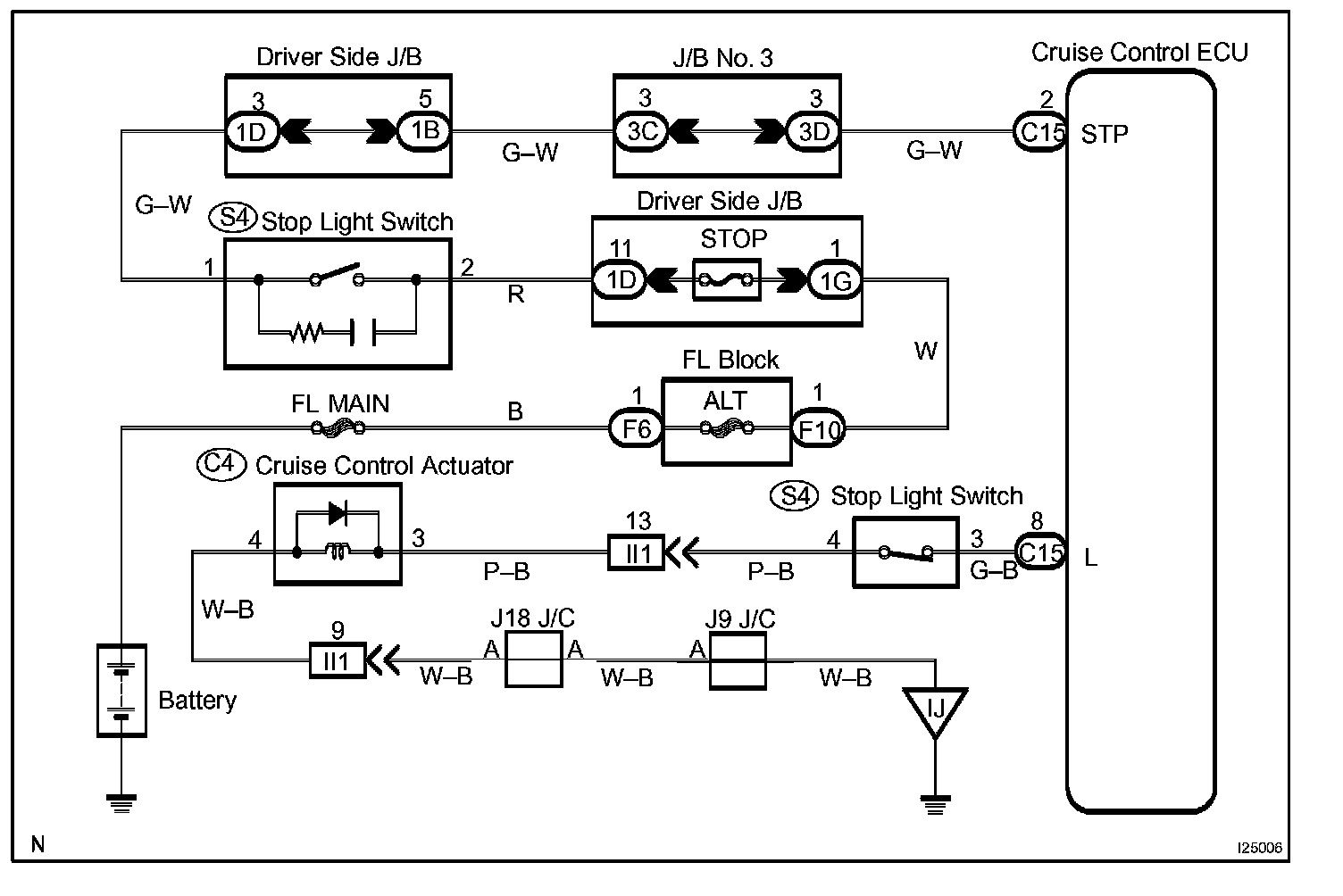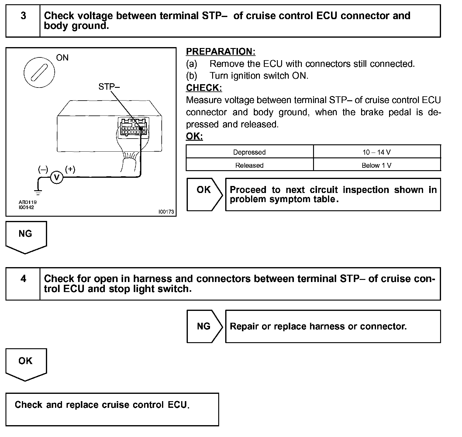 When the brake is ON, battery positive voltage normally is applied through the STOP fuse and stop light switch to terminal STP- of the ECU, and the ECU turns the cruise control OFF. If the harness connected to terminal STP- has an open circuit, terminal STP- will have battery positive voltage and the cruise control will be turned OFF