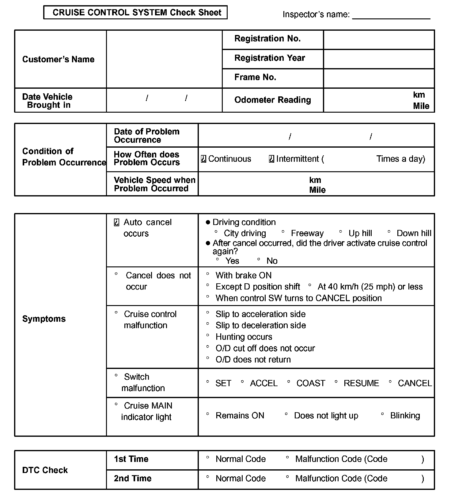 Cruise Control System Check Sheet: