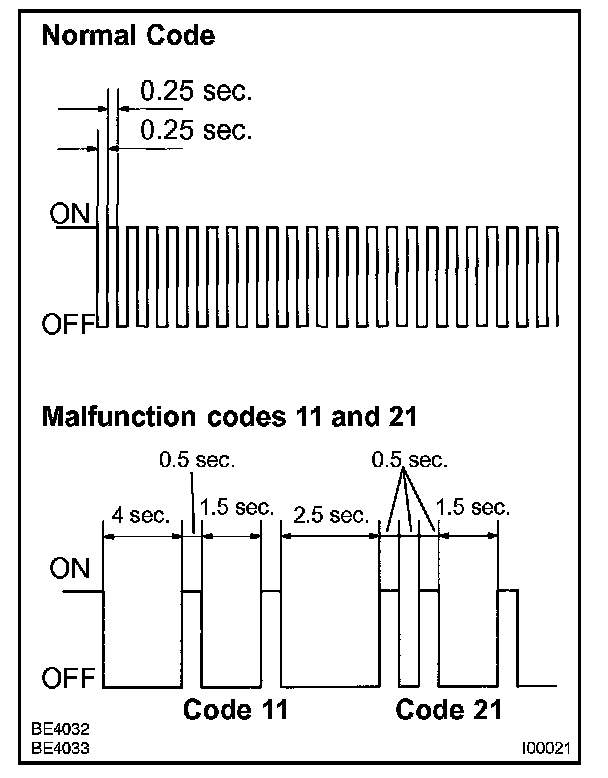 - As an example, the blinking patterns for codes; normal, 11 and 21 are shown in the illustration.