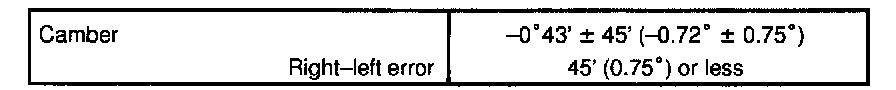 If the measured value is not within the specified value, inspect the suspension parts for damage and/or wear and replace them if necessary because camber is not adjustable.