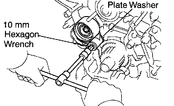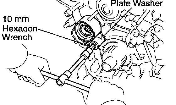 Using a 10 mm hexagon wrench, remove the bolt, idler pulley and plate washer.