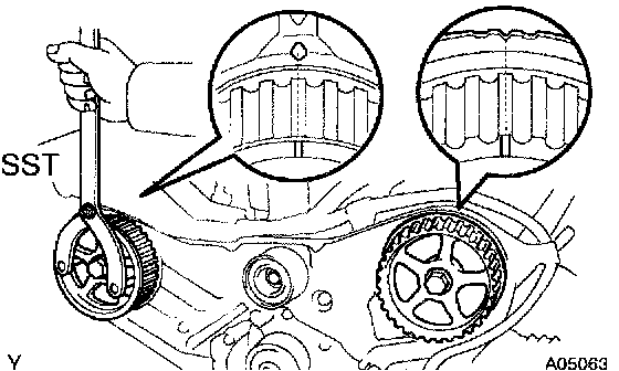 Using SST turn the camshaft pulley, align the timing marks of the timing pulley and No.3 timing belt cover.