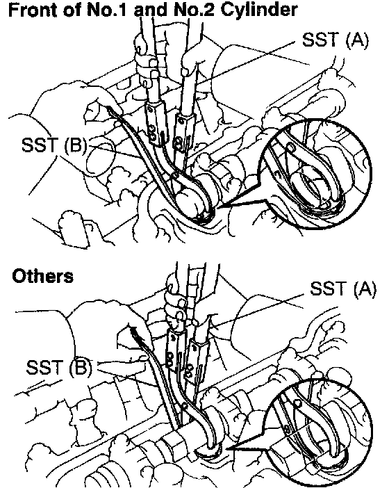 2. Press down the valve lifter with SST (A), and remove SST (B).