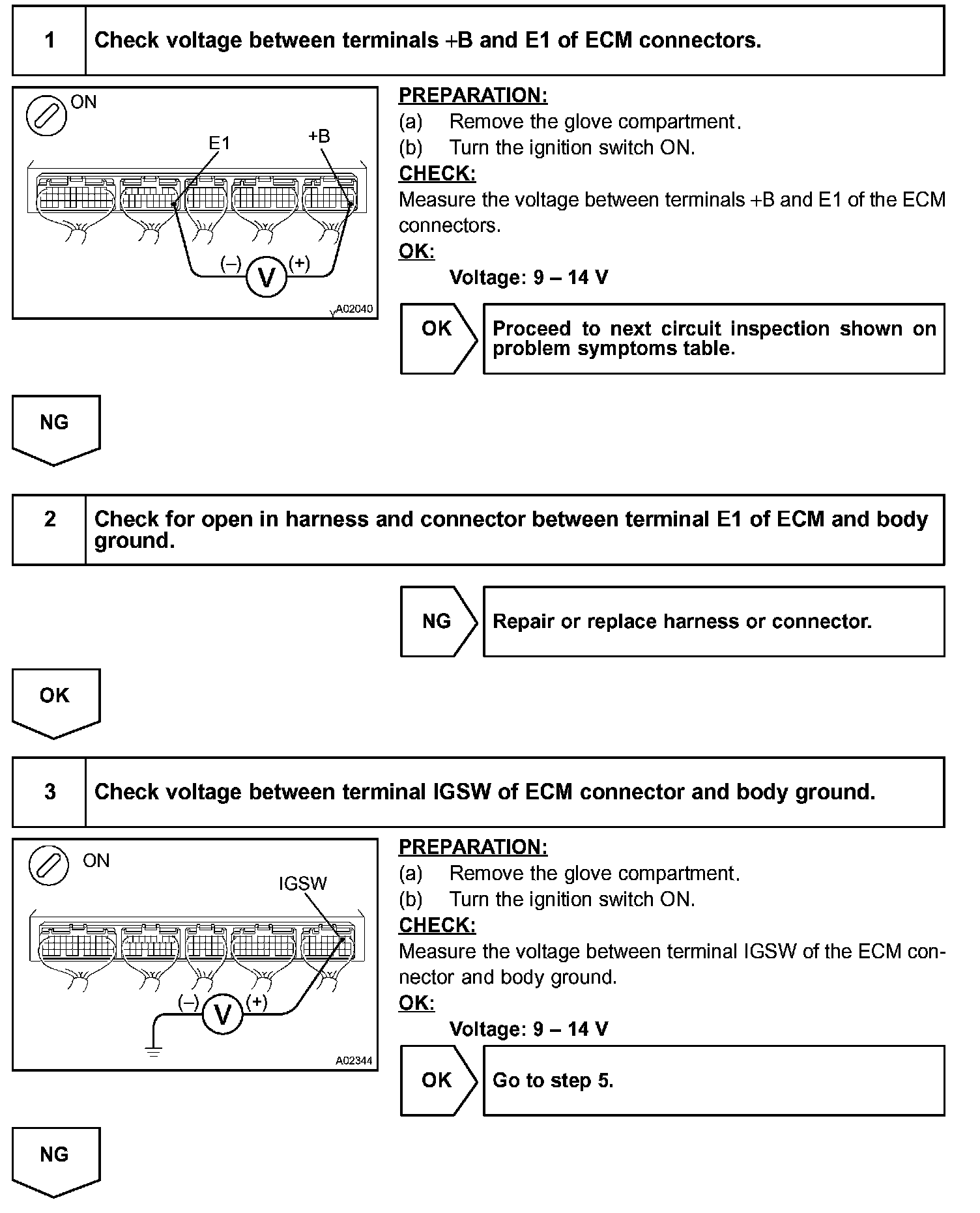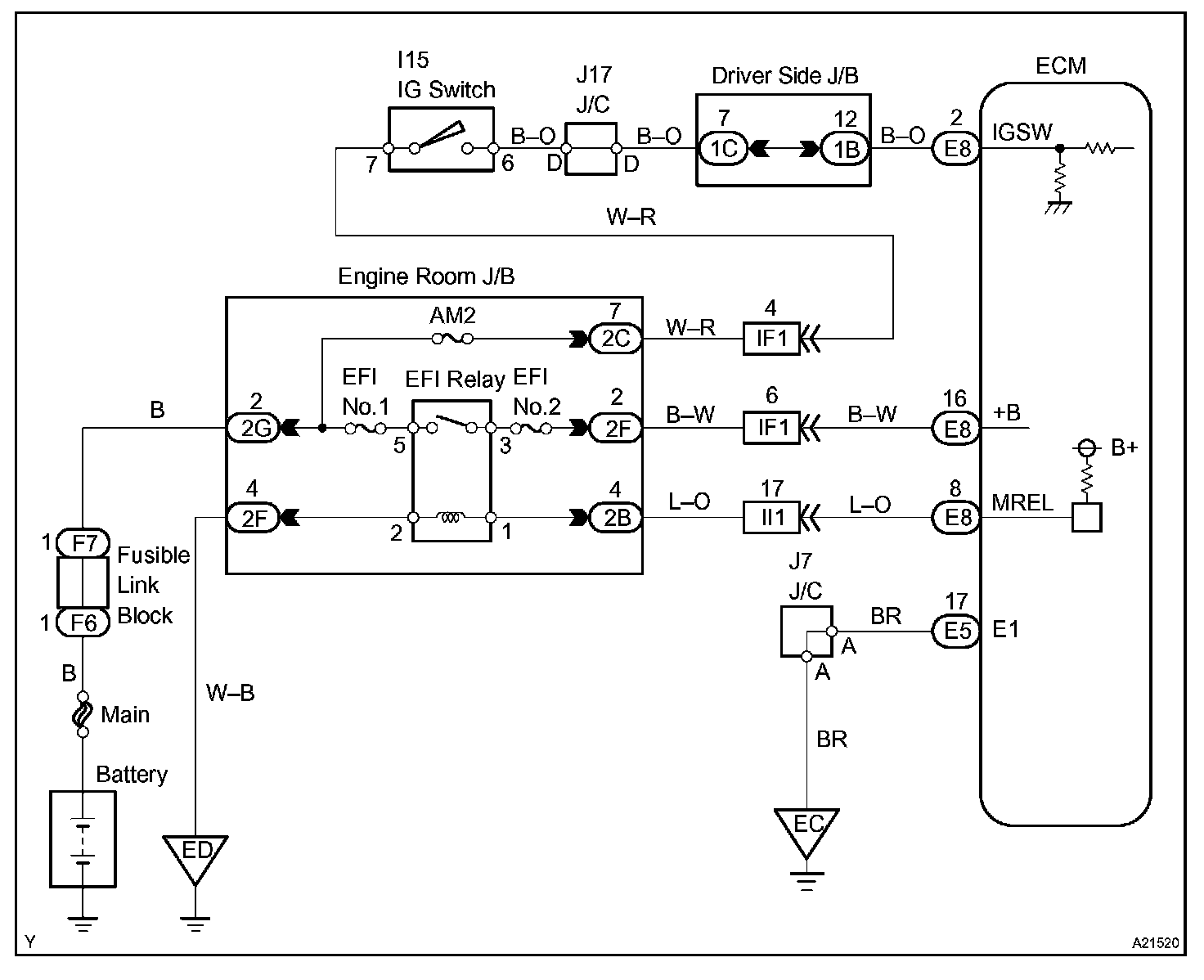 This signal causes current to flow to the coil, closing the contacts of the EFI main relay and supplying power to terminal +B of the ECM. If the ignition switch is turned off, the ECM continues to switch on the EFI main relay for a maximum of 2 seconds for the initial setting of the IAC valve.