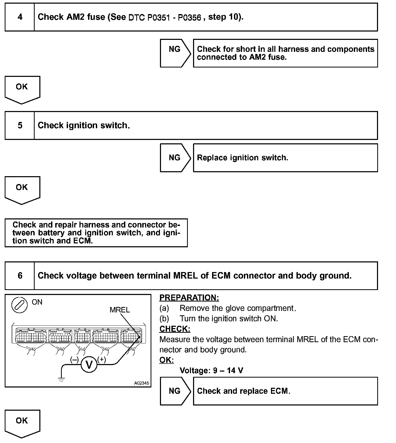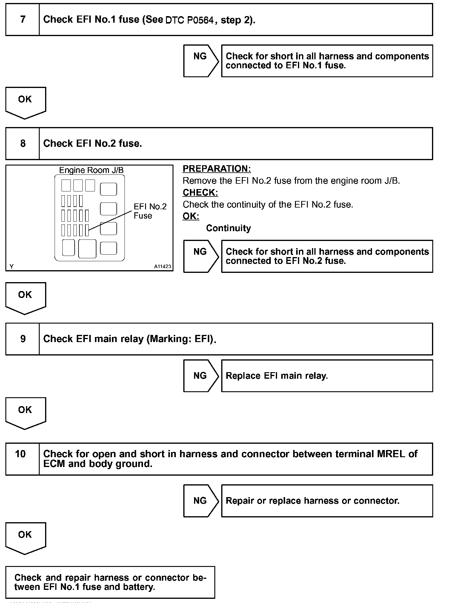 CIRCUIT DESCRIPTIONWhen the ignition switch is turned ON, battery positive voltage is applied to terminal IGSW of the ECM and the EFI main relay (Marking: EFI) control circuit in the ECM sends a signal to terminal MREL of the ECM switching on the EFI main relay.