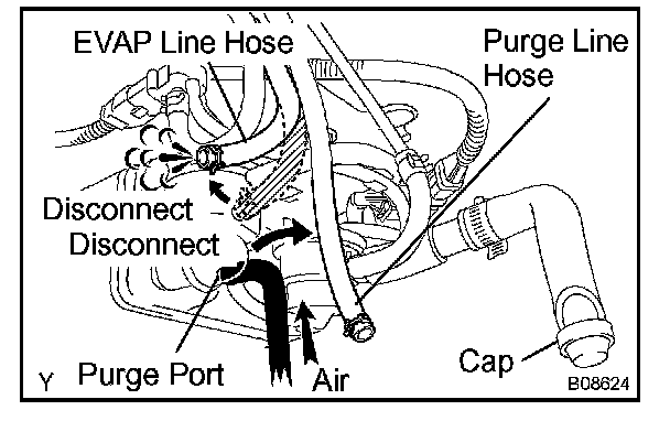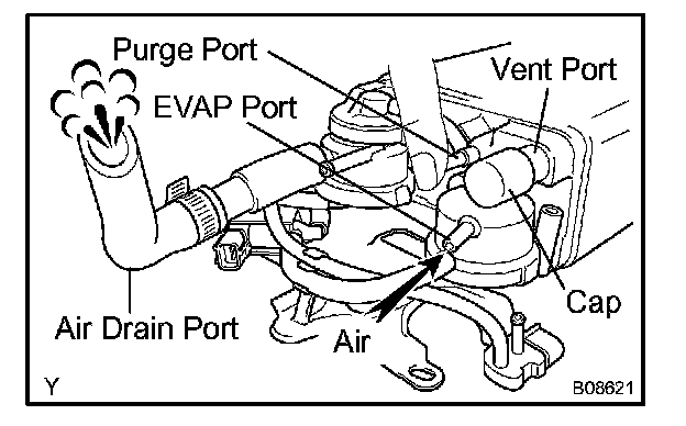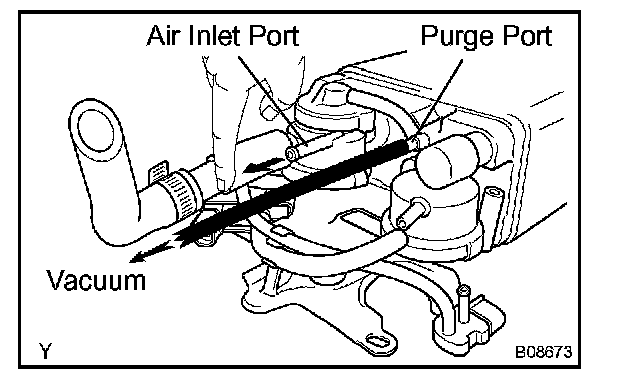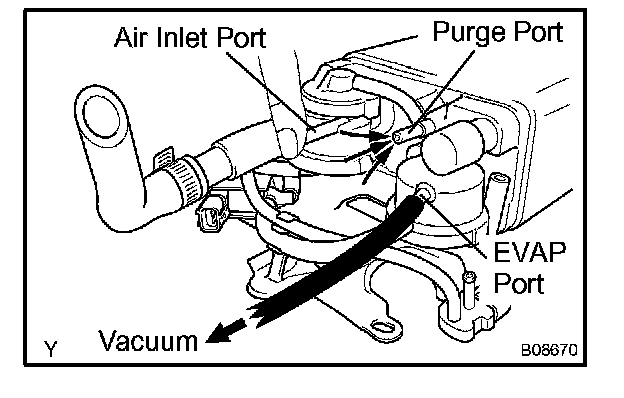 5. While holding the air inlet port closed, apply vacuum (3.43 kPa, 25.7 mmHg, 1.01 in.Hg) to the EVAP port and check that air flows into the purge port.