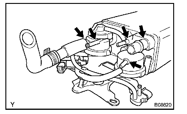 d. Disconnect the purge line hose, EVAP line hose and air inlet line hose from the charcoal canister.