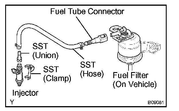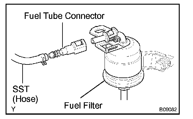 b. Connect SST (hose) and fuel tube connector to the fuel filter outlet.