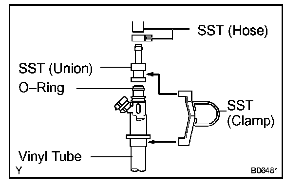 d. Connect SST (union and hose) to the injector, and hold the injector and union with SST (clamp).