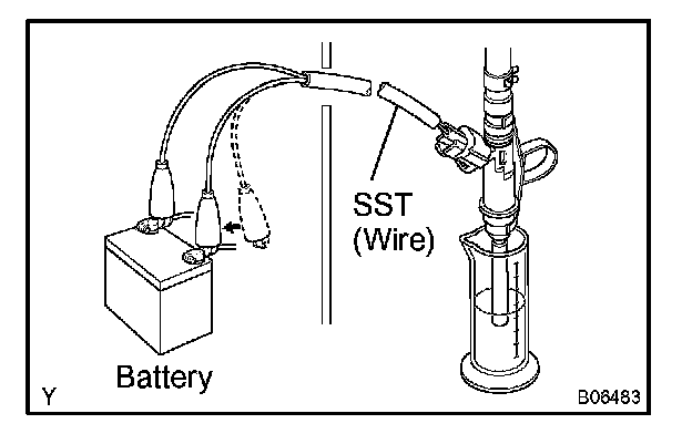 k. Connect SST (wire) to the injector and battery for 15 seconds, and measure the injection volume with a graduated cylinder. Test each injector 2 or 3 times.