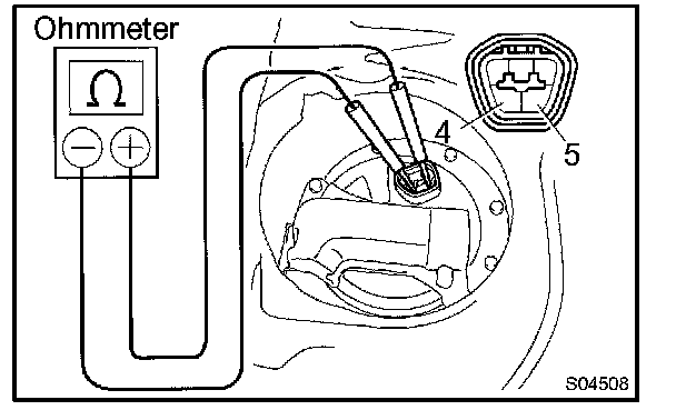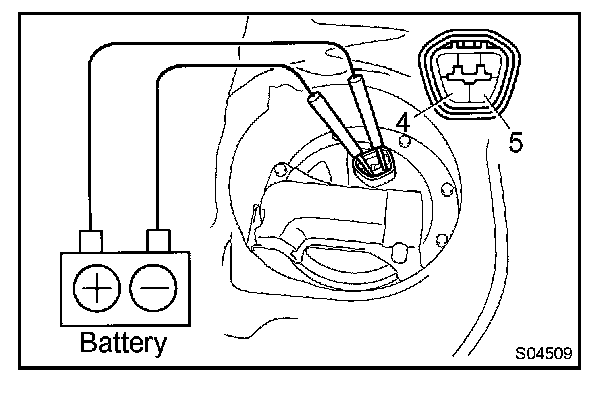 Connect the positive (+) lead from the battery to terminal 4 of the connector, and the negative (-) lead to terminal 5. Check that the fuel pump operates.