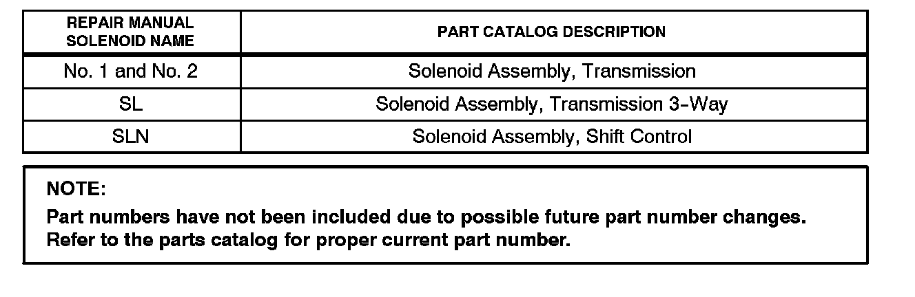 Provided above is a chart listing the Repair Manual name of each solenoid used in the A541 E transmission as well as the part name description provided in the electronic parts catalog.